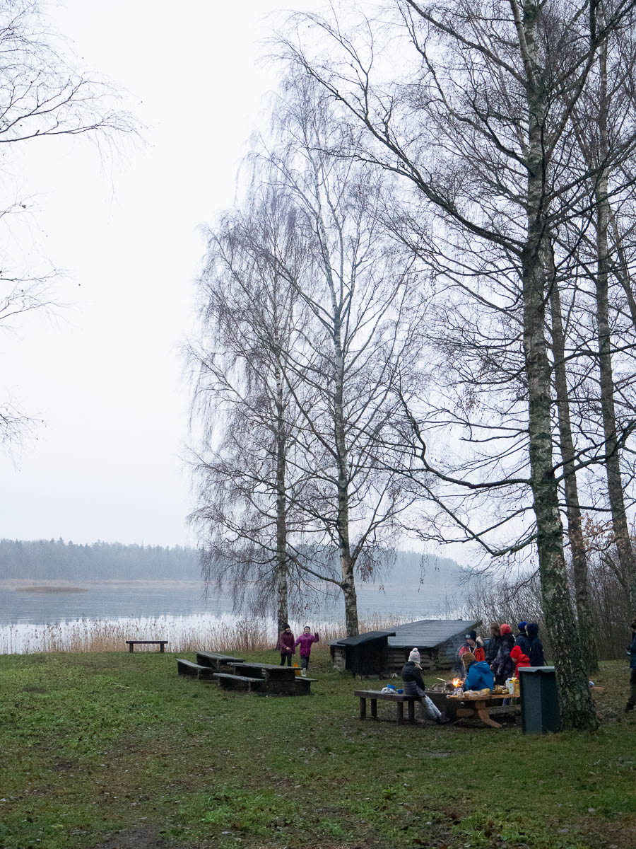 Walking through a gray morning to pick up Ingrid from a scout hike.