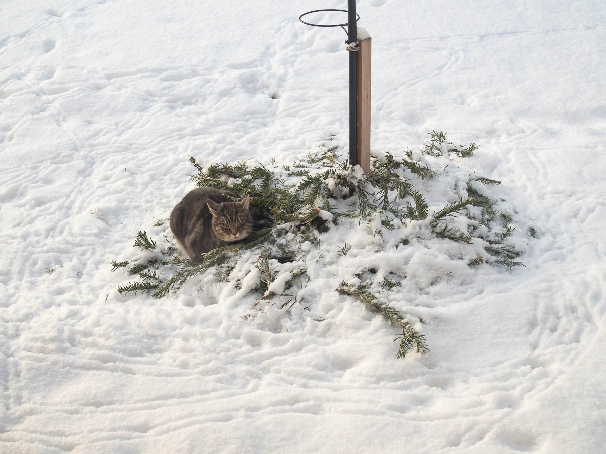 The cat doesn’t seem to mind scratchy fir branches at all and has made itself a nest in them. And keeps catching and eating little birds.