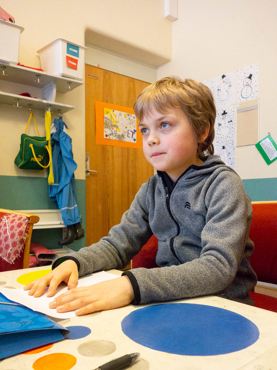 It’s parent/teacher conference day at school. Adrian is very seriously presenting his recent work to us.
