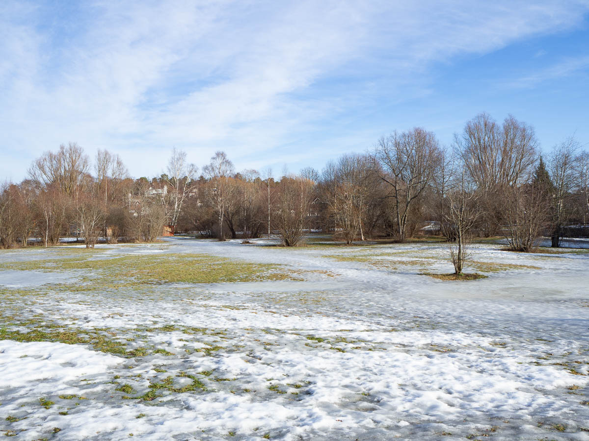 Packed ice on the unsanded paths of convenience, muddy ground in between. But the ground itself has mostly thawed now. It was different a few days ago, when the ground was still frozen hard and the snow melt water had nowhere to escape – there were deep, icy puddles everywhere.