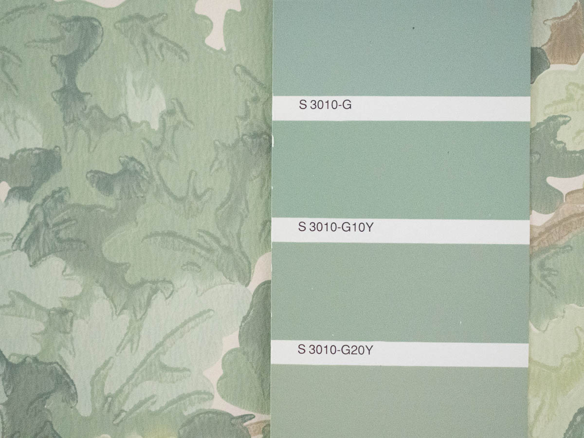 Perhaps the kitchen could match one of the green tones on the living room wallpaper?