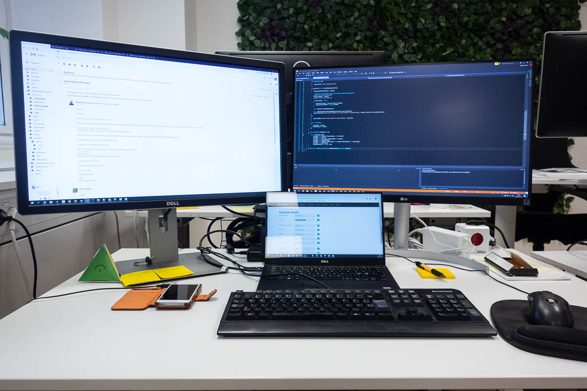 Happy day! Finally, finally, after more than a year, I got a second monitor at work. The company is very sensible and progressive about most things but for some reason the standard setup only includes a single monitor. I think it may be because most of the developers who sit in the office are between projects, and those who have a project are mostly at the customers’ offices, using whatever equipment is there. In fact this is so non-standard that the desks barely fit two monitors.