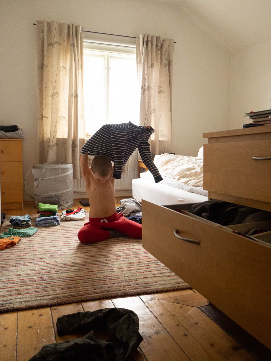 We’re going through all the clothes in Adrian’s dresser, sorting out the old, outgrown, unliked, worn-out ones to make more room for the clothes that Adrian actually wears. Some of his softest, most favourite t-shirts were size 4–6 years and clearly way too small to my eyes, but he still wanted to try them on to make sure. Others he discarded without a second thought.