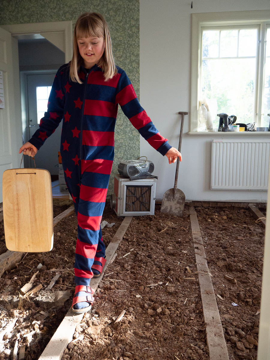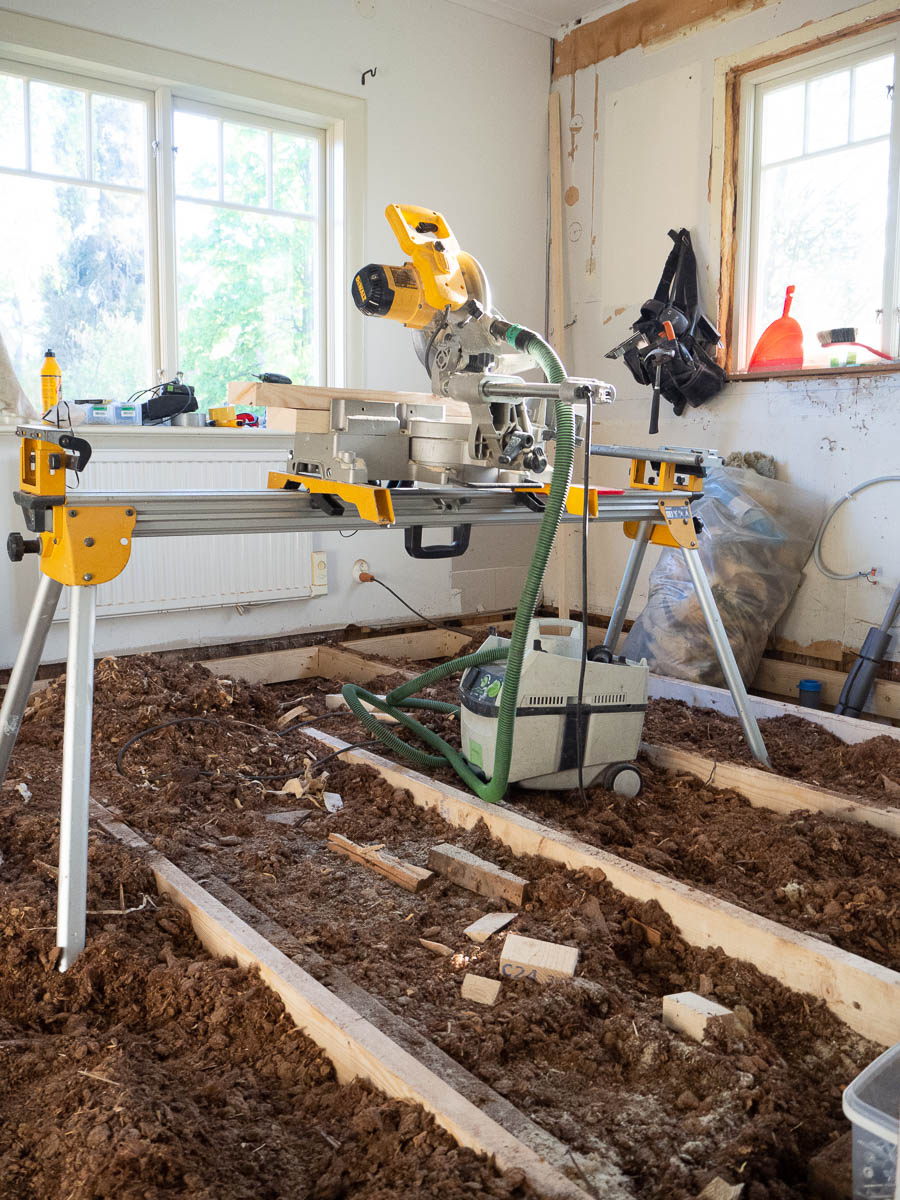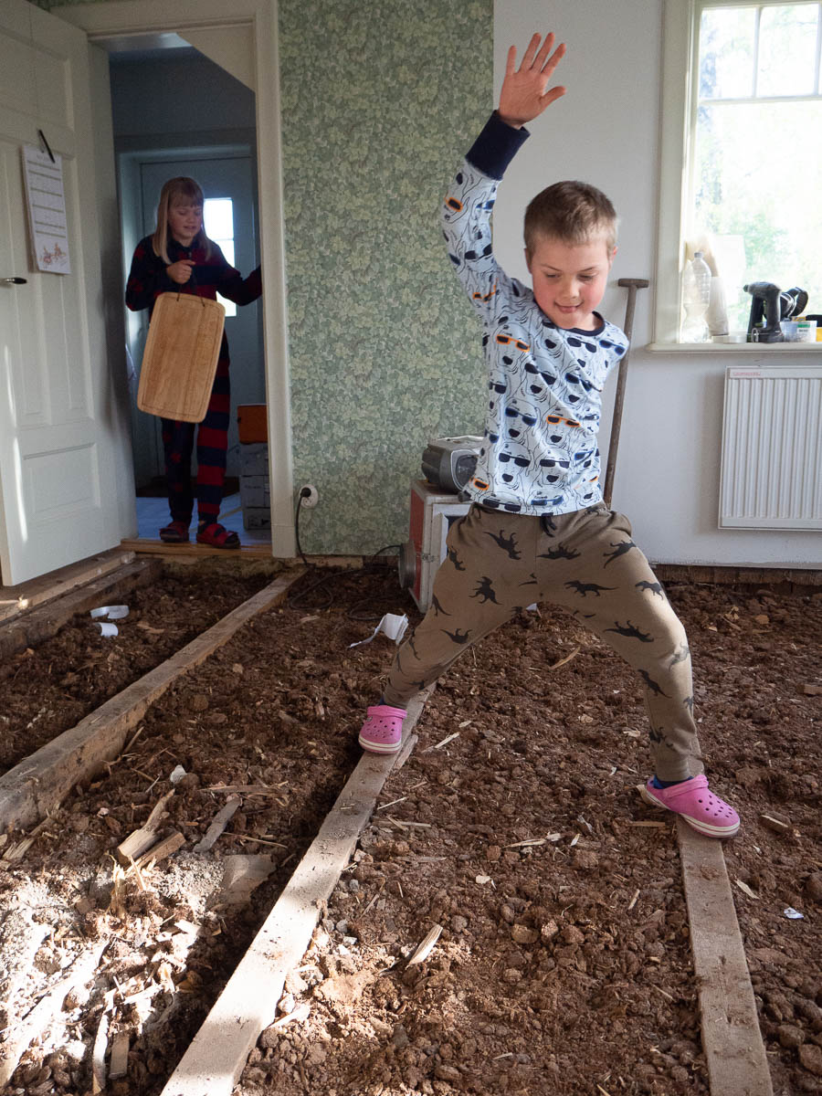 The old pine floor has gone the way of the cupboards. A trip to the laundry room (for e.g. water) now involves either balancing on the floor joists or walking through peat dust. Balancing is definitely both more fun and more comfortable.