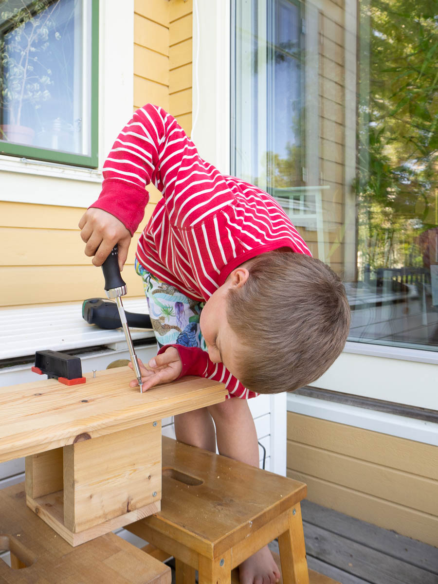 We’re continuing work on Adrian’s boat-ferry-thing and now attaching the cabin thing to it. The builders working on the kitchen kindly lent us two minutes of their time and cut the parts for the cabin on their power saw, so that Adrian could focus on the fun part, which is measuring and then assembling it all.