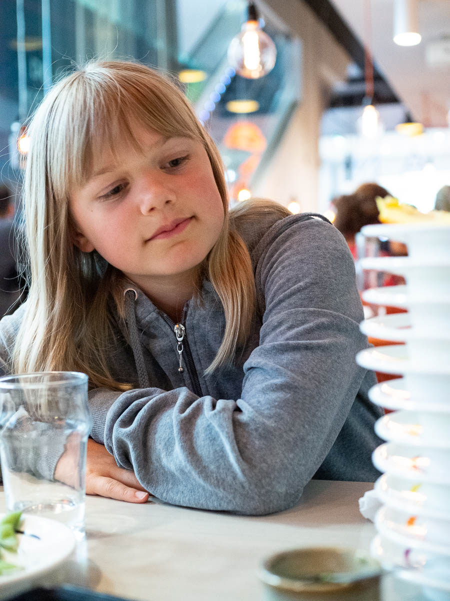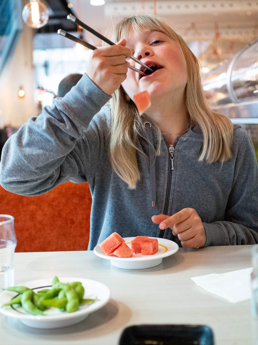 Afterwards we had our traditioal conveyor belt sushi lunch at Zan in Kista. Ingrid is working on her chopstick skills: she has learned an odd grip, with the chopsticks crossed, and is now trying to unlearn it to get a better… um… grip on whatever she’s trying to grab. With slippery metal chopsticks and slippery, hard watermelon pieces, it’s quite a challenge.