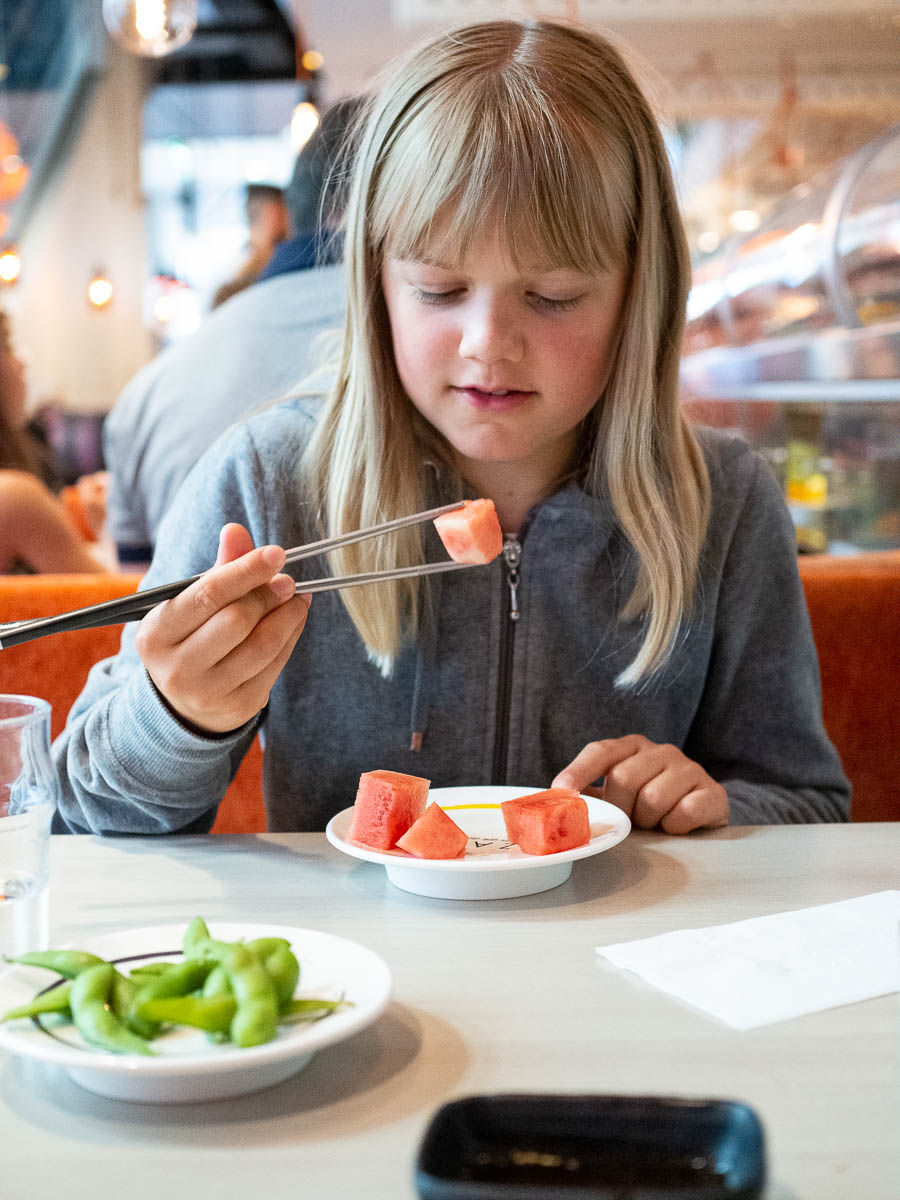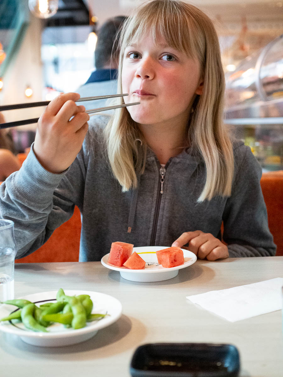 Afterwards we had our traditioal conveyor belt sushi lunch at Zan in Kista. Ingrid is working on her chopstick skills: she has learned an odd grip, with the chopsticks crossed, and is now trying to unlearn it to get a better… um… grip on whatever she’s trying to grab. With slippery metal chopsticks and slippery, hard watermelon pieces, it’s quite a challenge.