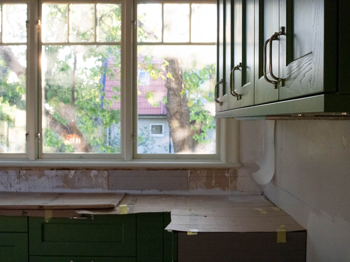 Still missing: countertop, sink and tap, electrical outlets, wall tile, floor.