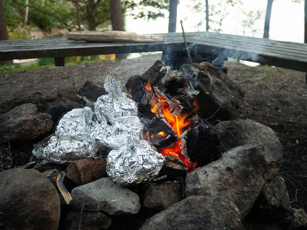 Somehow the preparations took me most of the day, even though I started just after breakfast. Getting all the gear, packing my own stuff, helping Adrian pack, shopping food, prepping food… by the time we were at the parking lot at Brakmaren, it was already six o’clock. We had a four-kilometre hike to the lake, and then there was a fire to build and light, and dinner to cook. (For dinner we had our traditional “hajkbomb” and then a delicious dessert of sauteed apples with chopped nuts and chocolate and cinnamon.)