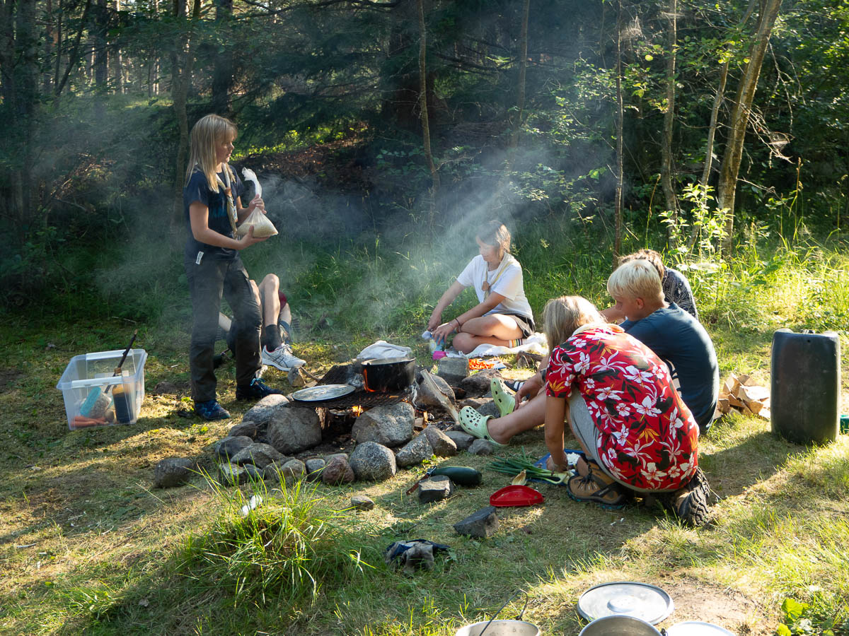 We are all here all day long, but I’ve barely seen Eric or the kids. Eric and Adrian I see briefly during my shifts in the kitchen when I serve food to everyone, but otherwise we all have our separate activities in different corners of the camp. Ingrid I didn’t see at all until I went exploring the camp and looking for her group. I found them cooking lunch over a campfire.