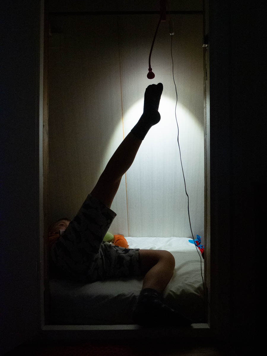 Adrian thinks the same. The loft bed stays, but mostly for its desk and armchair parts. For sleeping, Adrian chose the side attic.
