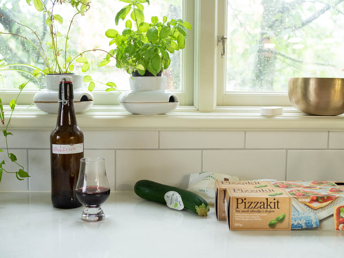 There are cooking wines that you cook dinner with, and then there are cooking wines that you drink while cooking dinner. I very rarely drink any alcohol at all, but the fruit wines that Eric has made are all delicious. I usually don’t remember them, again because I don’t have a habit of drinking. But sometimes when I go to the pantry to fetch vinegar or olive oil or some other bottle, I notice that lovely bottle of wine next to it. So that’s when I pour myself a splash of it.
