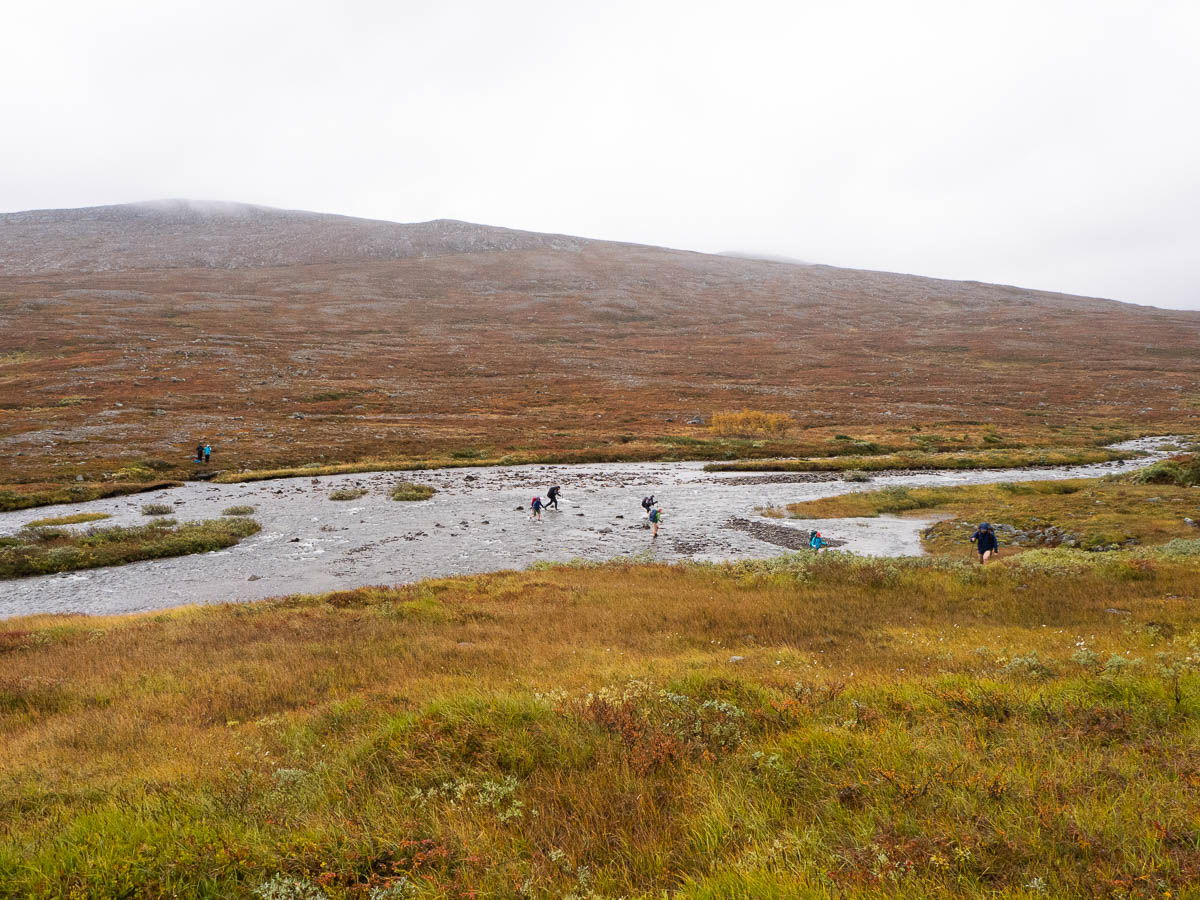 I think I had probably spent about an hour at this river by now, and gotten nowhere. Just as I was feeling rather lost, more hikers caught up with me, and then even more. One of them shared information they had heard earlier from hikers going in the other direction, who had forded the river much further upstream. Based on their description (“small islands in the river”) and our maps, we figured out where that spot was, and then we set out walking upstream again. If nothing else, we agreed, the river would get smaller – based on the maps it seemed to become a stream a few kilometres up.