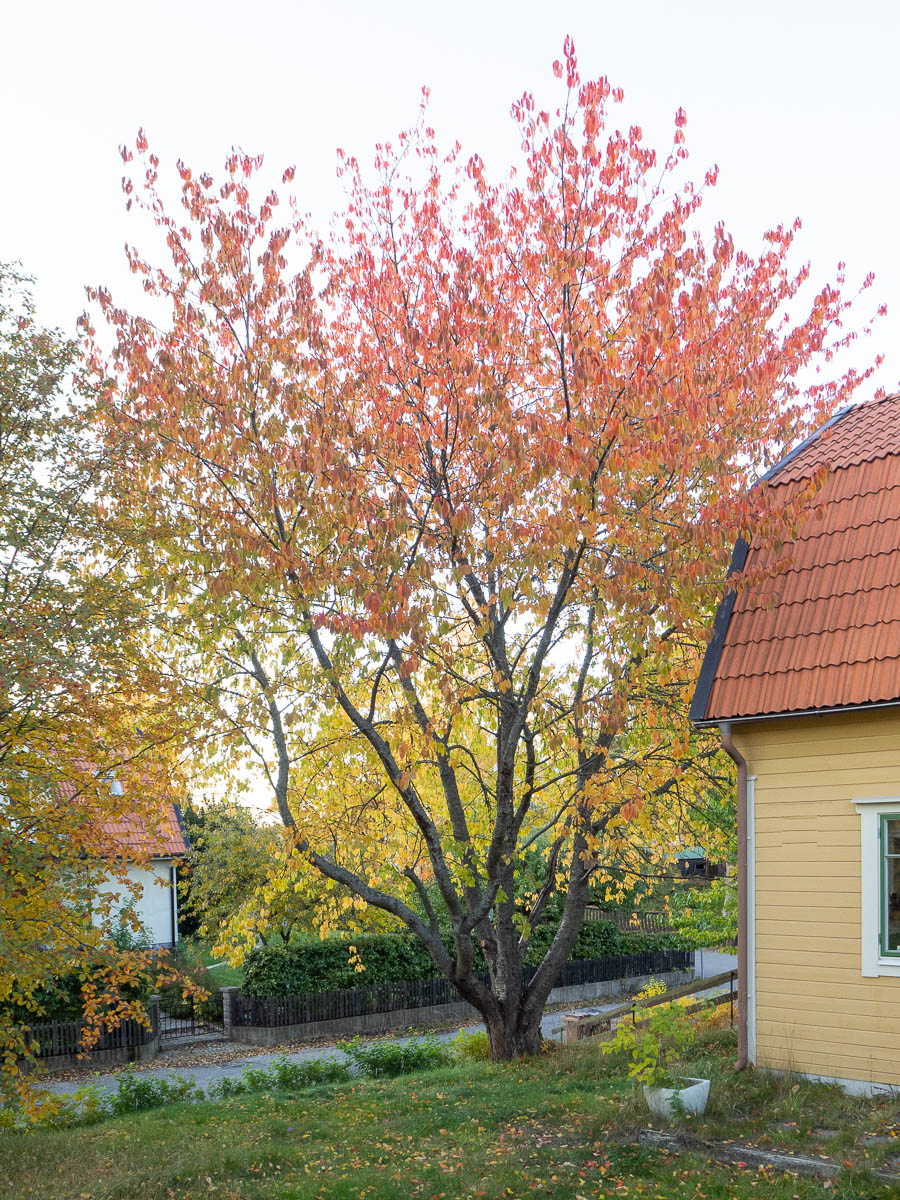 Actually we have three cherry trees. What “the cherry tree” refers to depends on the season. In the summer, it’s the one behind the house, with the sweet and juicy berries. (The others bear small, sour berries that we don’t pick or eat.) In the autumn, it’s the one in front of the house, with the fiery colours. The third tree is smaller and younger and less colourful. I even considered cutting it down because, honestly, how many cherry trees do you need in a garden? But I just couldn’t do it. Now I kind of think of it as a backup for the autumn tree, in case that one dies because of how many large branches and roots it lost when we had to dig up the water pipe.