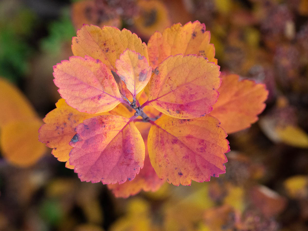 Autumn is not my favourite season, but I do love its colours. When I planned and planted the hedge, each bush’s autumn colours were a big part of my decision. There are spireas of several kinds with their interesting colour combinations (orange and purple!) and aronia bushes with brilliant red leaves and black berries. It looks colourful from afar, a bit scruffy when you get closer, and then stunning again when you get really close.