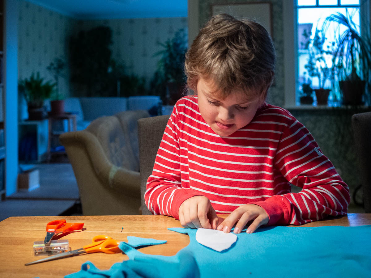 Helping kids with their crafts projects is a tricky balancing act. If I help and meddle and guide too much, it’s not fun. But if I meddle too little and the final result comes out way too wonky, he will be disappointed in it and won’t want to sew again. He’s not so fast at it that he could just throw the first attempt away and make a new one. So I meddle just enough to help him avoid mistakes that would be hard to recover from – and also help him understand that the smaller mistakes that he does make are not the end of the world and can be recovered from.