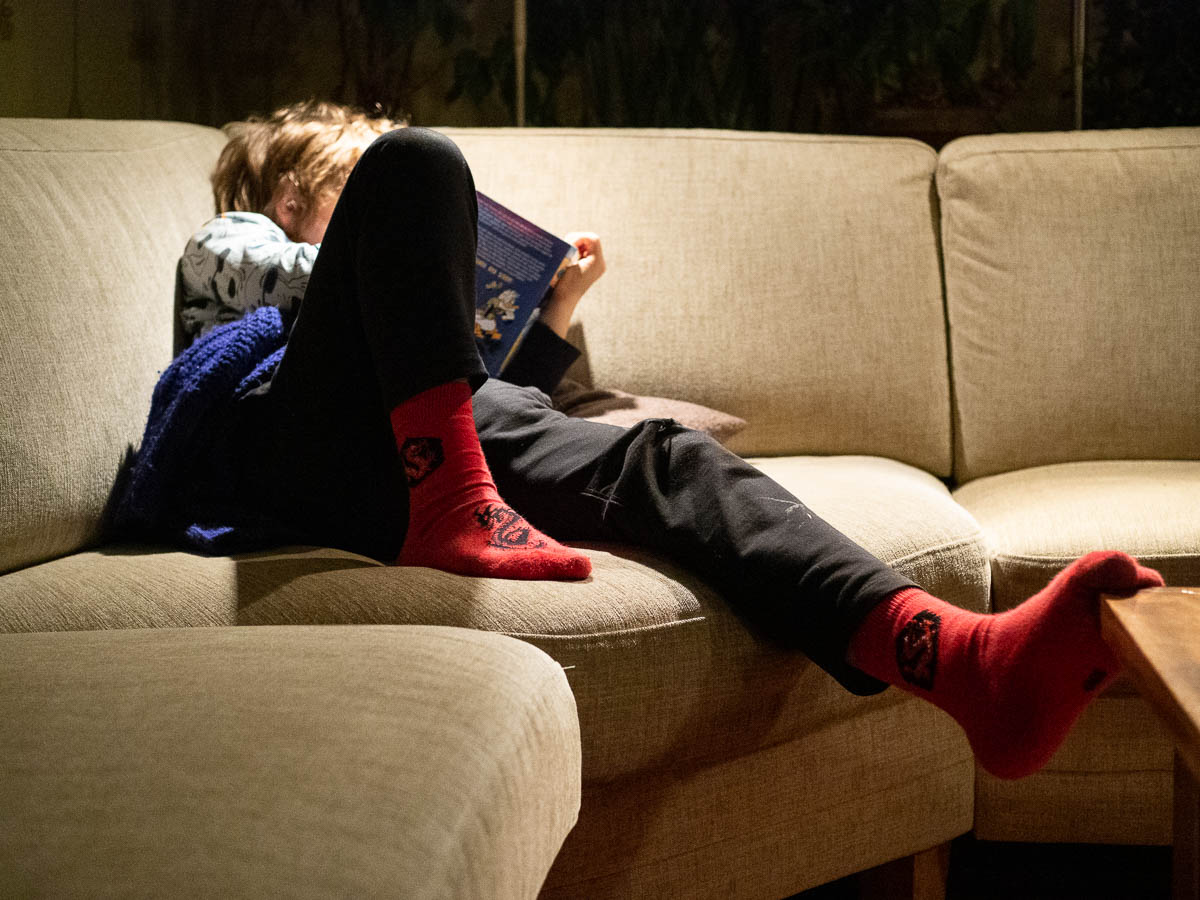 Favourite position in favourite corner of the sofa, with favourite oversized sweater and favourite reading matter.