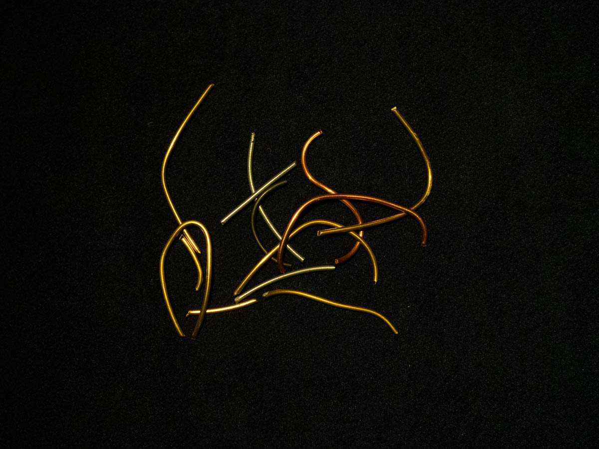 This is his latest treasure: waste pieces of thick wire in various finishes, from the crafts room at school. (They’re doing wood and metal crafts this term.) Pocket-sized, shiny, endlessly fiddlable.