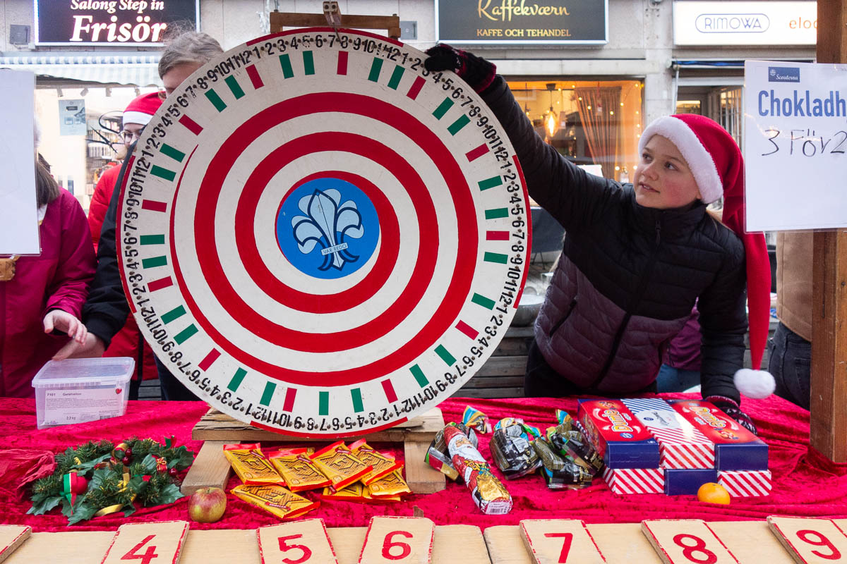 It’s the day of the annual Christmas market in Spånga. It’s mostly filled with school classes and sports clubs selling homemade sweets and cakes, and some stands with crafts. The Spånga scout group is out in force with their traditional chocolate wheel of fortune, and their gingerbread house lottery. Ingrid’s group is manning the chocolate wheel again.