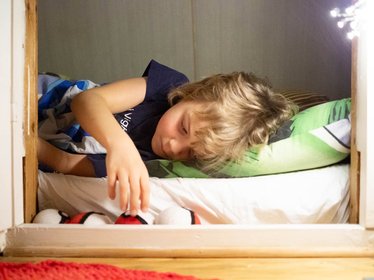 The side attic in Adrian’s room is still his “bedroom” and seems to suit him perfectly. The attic is a bit longer than his mattress, and he filled the empty space with all his soft toys. And the gap between the mattress and the threshold is apparently perfect for pokeball storage.