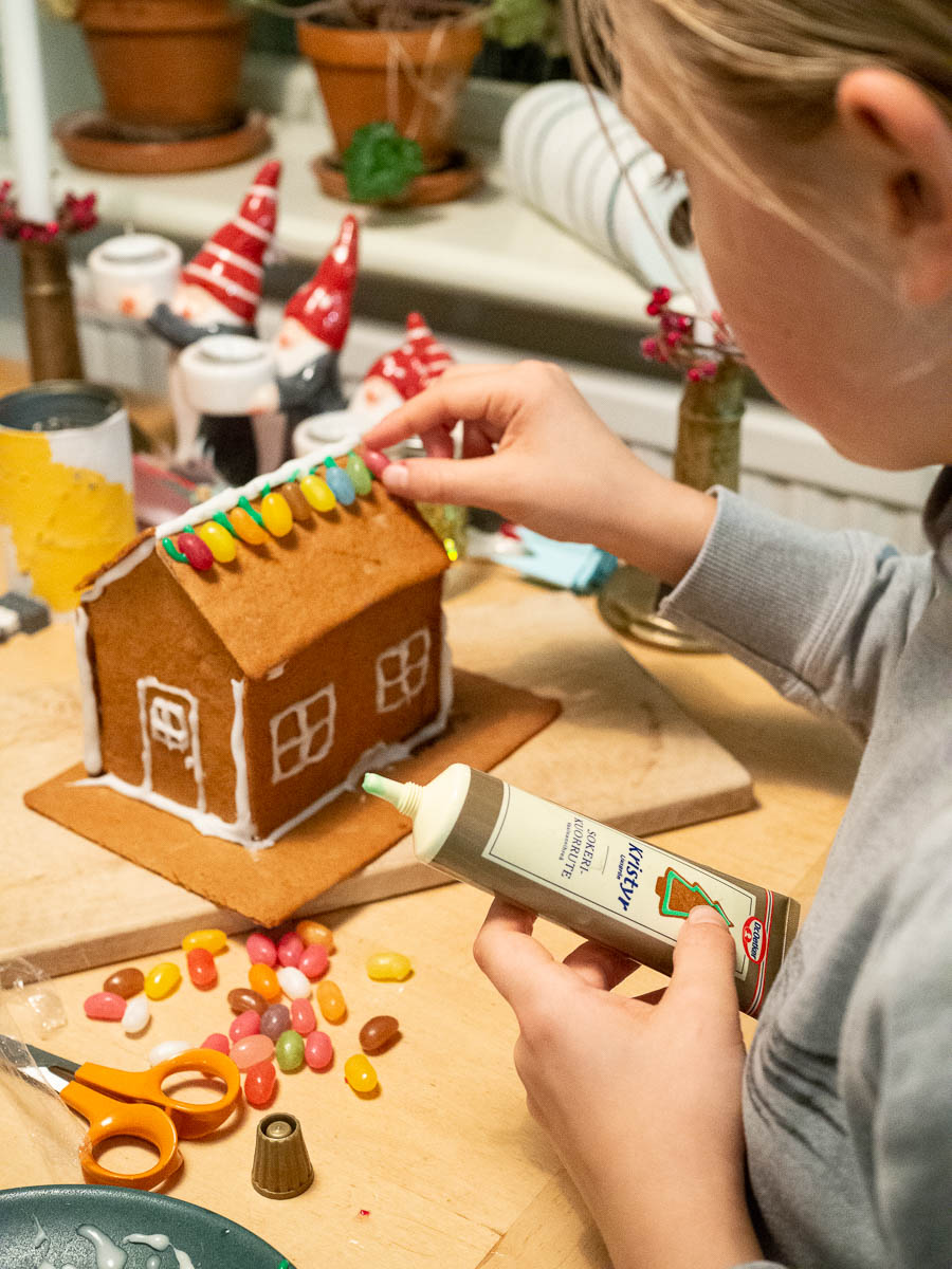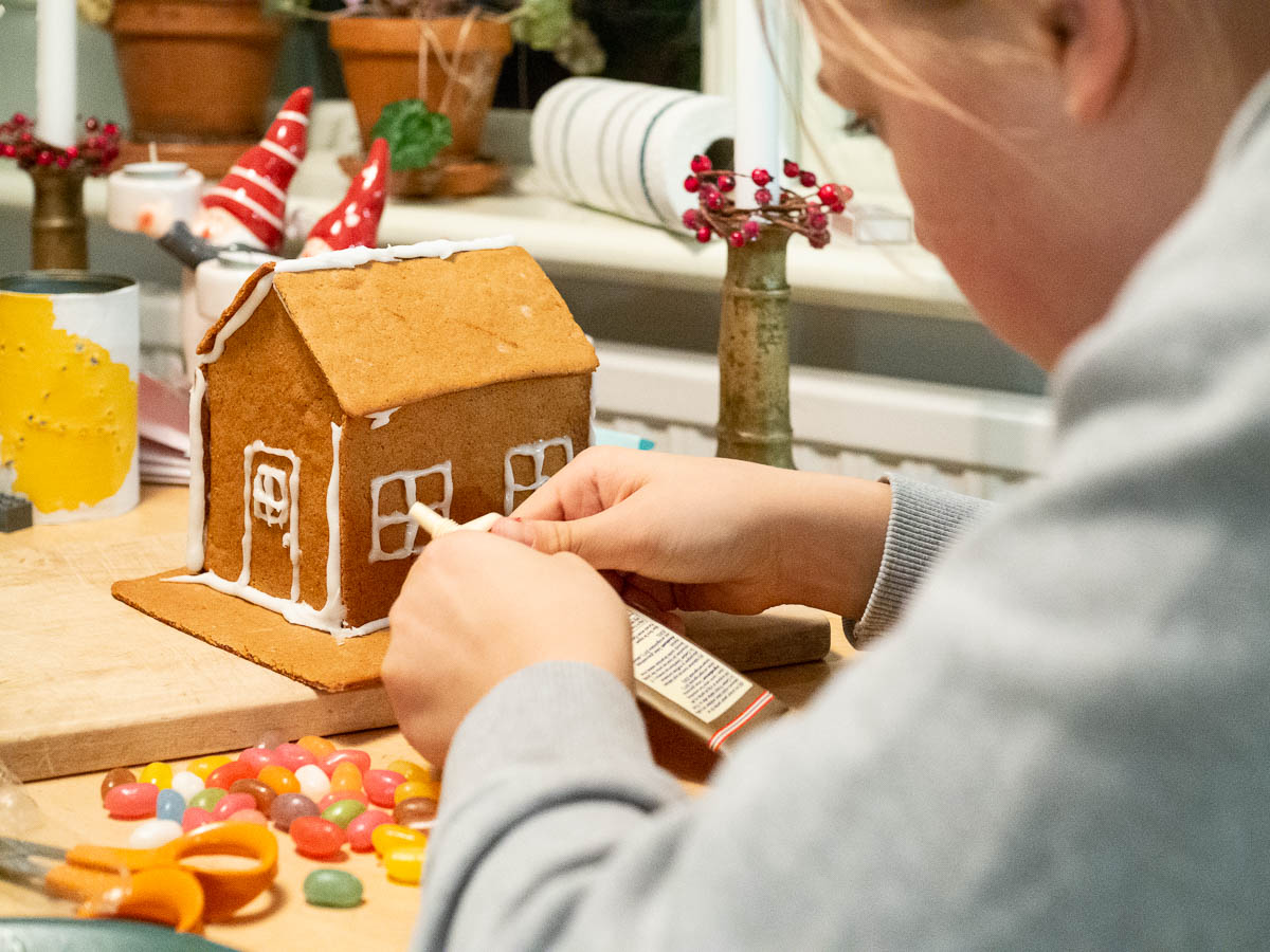 Decorating the gingerbread houses that the were assembled yesterday.