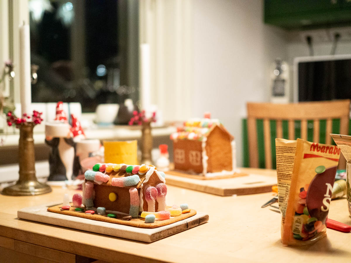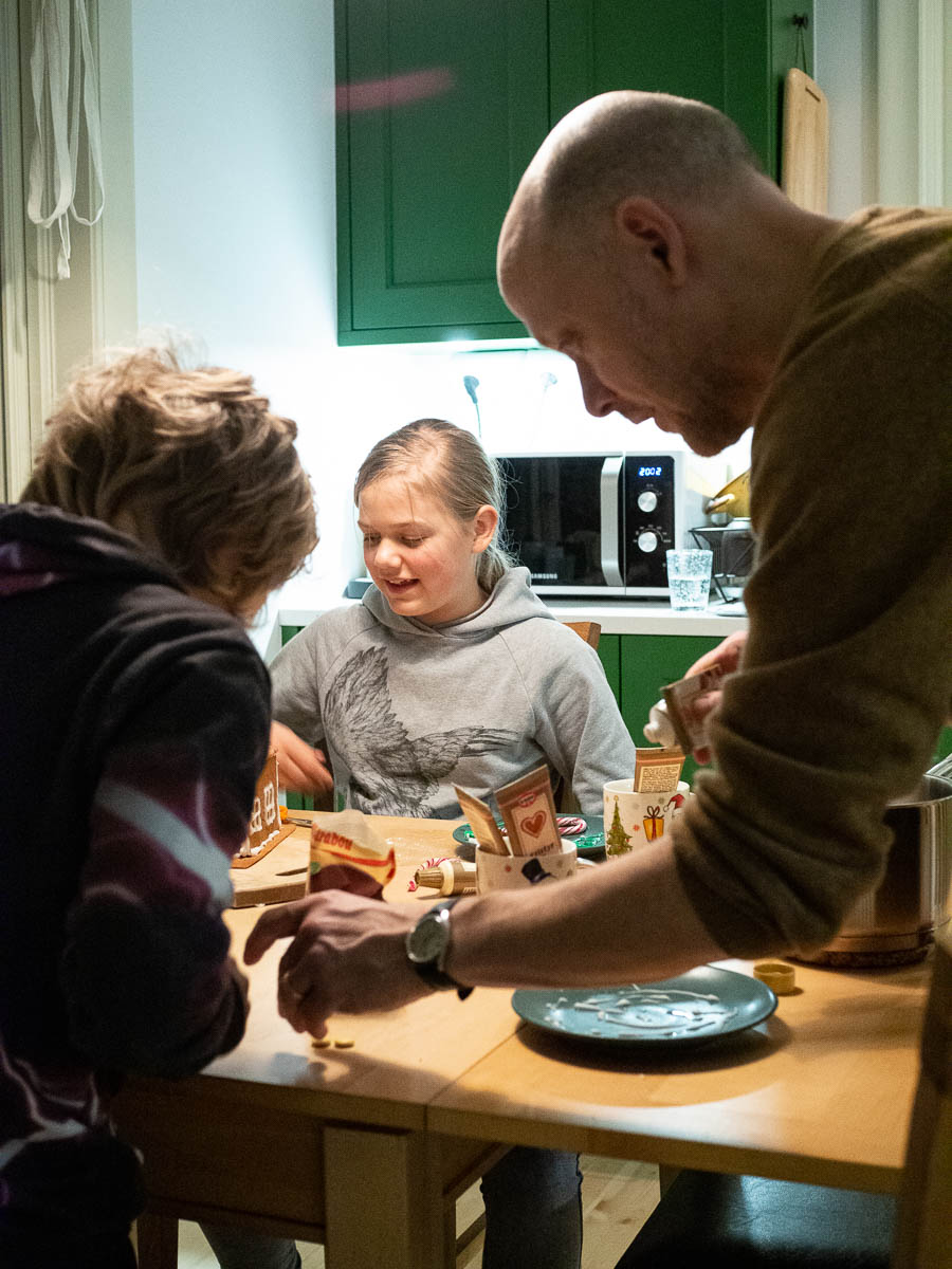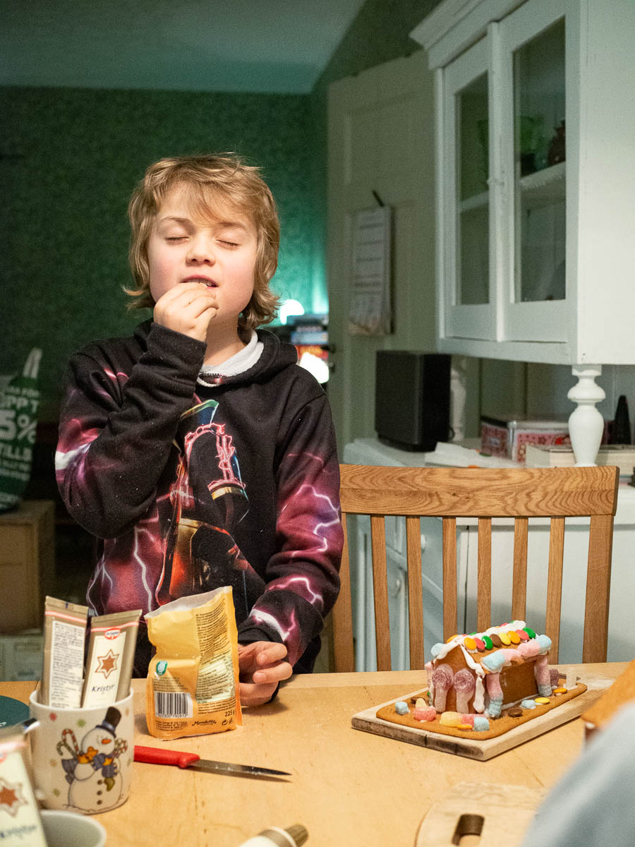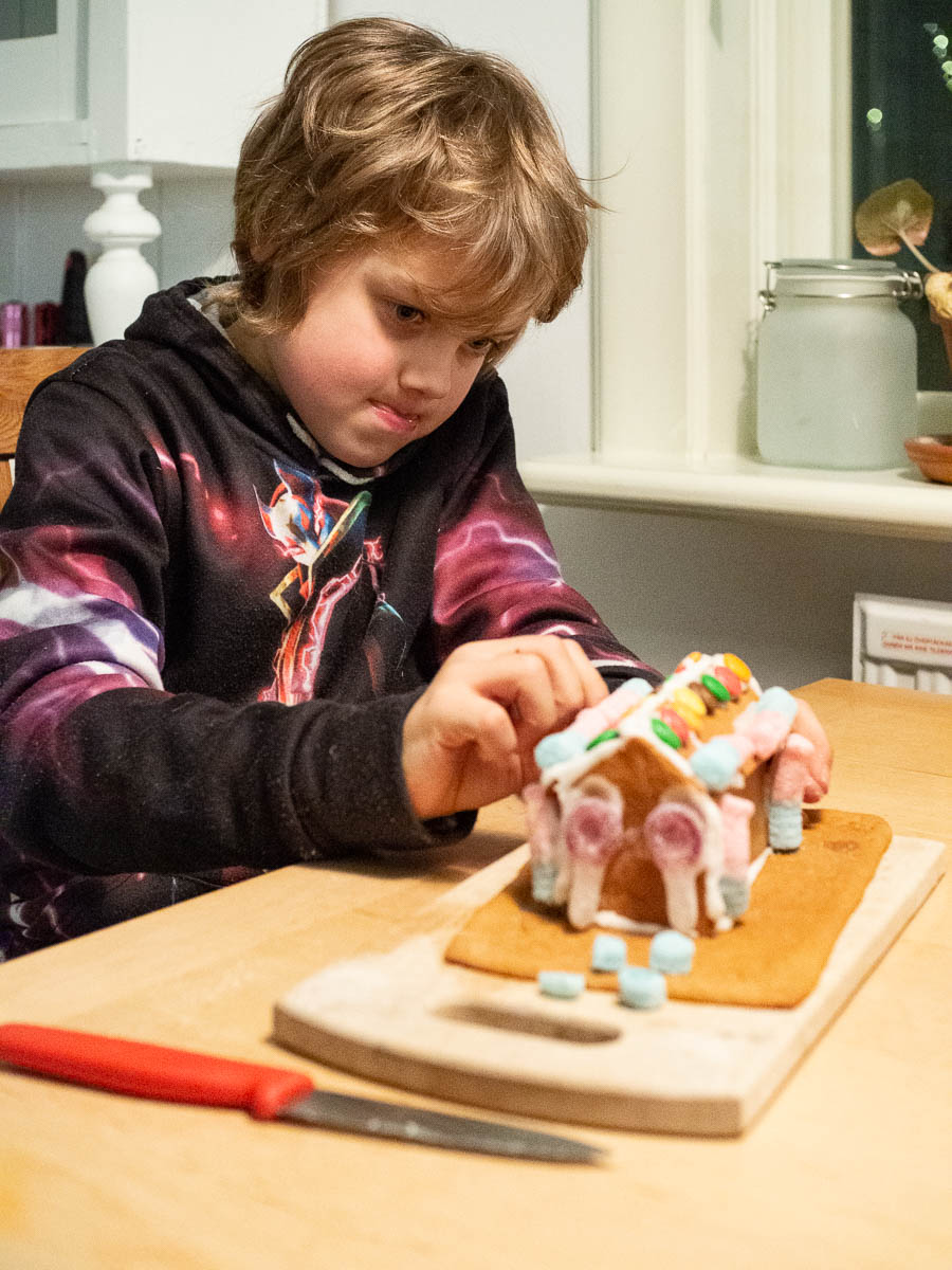 In the evening, the kids made gingerbread houses with Eric’s help. There are ready-made kits you can buy, but this year they’re making them almost from scratch. (But using store-bought dough, because by the time we eat them they will be dry and dusty and using home-made dough would feel like a bit of a waste.) This way we can make much smaller houses, so it’s conceivable that we might actually eat them.