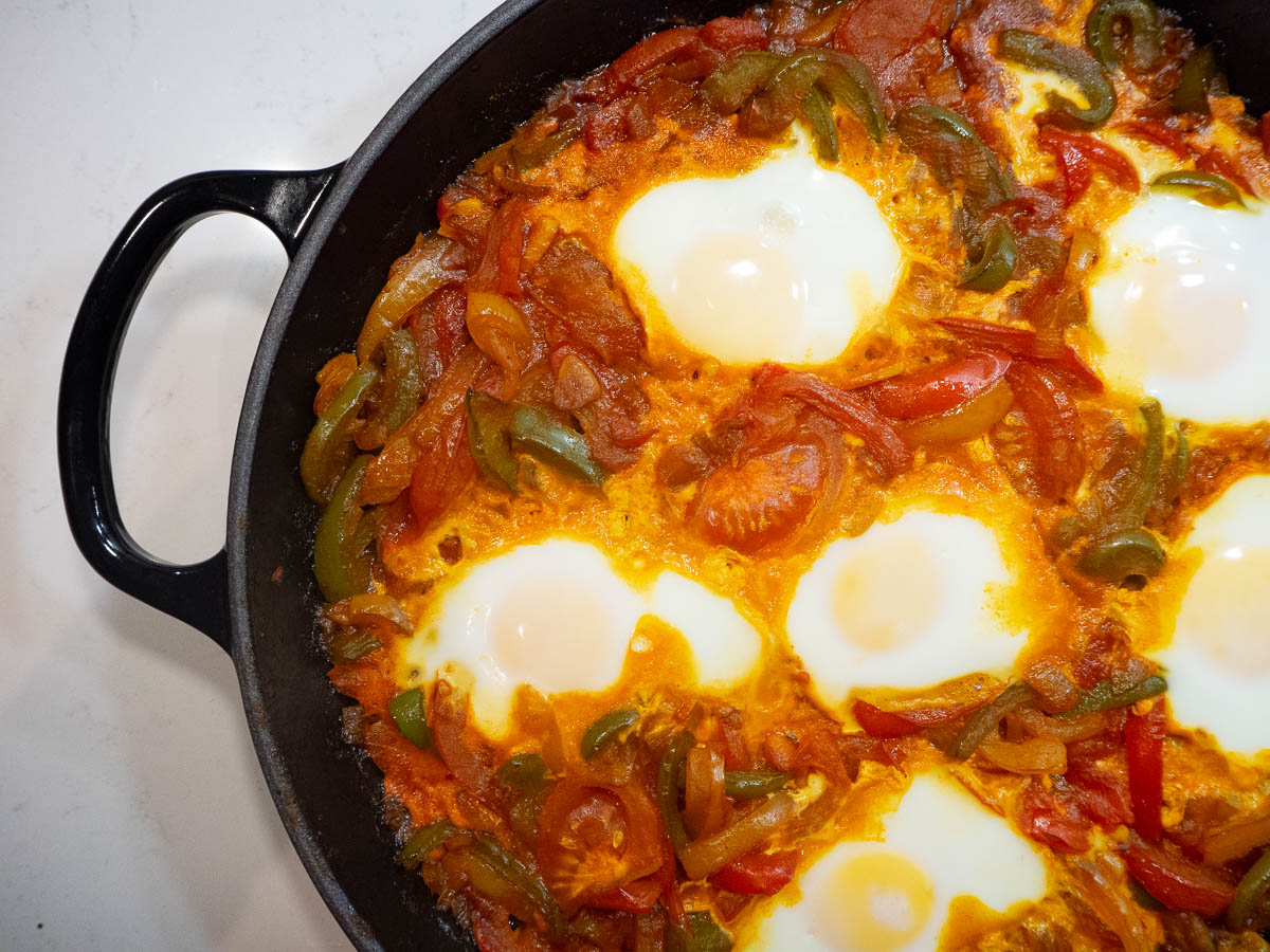 There are plenty of variations on shakshouka. This one, which for me will forever be the quintessential, original one, has plenty of bell peppers in the sauce. It’s almost a pepper sauce with tomatoes more than a tomato sauce. It also has onions and garlic of course, and cumin, paprika and saffron, plus something chili-ish.