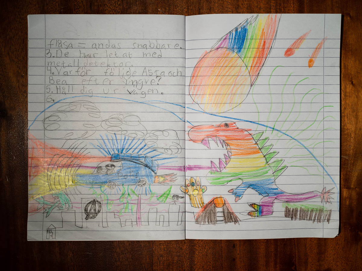 He doesn’t mind the reading, is not at all happy about the writing, but really enjoys the drawing. His drawing for this week’s theme of “blue lights and sirens” started out as just that police car in the middle of the left page. He could have left it at that and be done with the homework, but he just couldn’t stop. The car got all sorts of futuristic features – jet propulsion, a heat-seeking camera, lasers, some other kind of waves that I’ve forgotten – and then a city underneath it. The city then got a monster, a headquarters for the local superheroes, an aggressive vine, and purple waves of internet. Then another, larger monster outside the city, accompanied by further disasters in the form of a volcano, a meteor shower, and Thanos’ Infinity Gauntlet. Luckily the city then got a force field shield to protect it. Then the larger monster got nail polish and rainbow colours. And had Adrian not run out of space on the page, he would have continued. (He was going to expand to the next page but then you couldn’t see the whole scene at the same time any more and that wasn’t as much fun.)