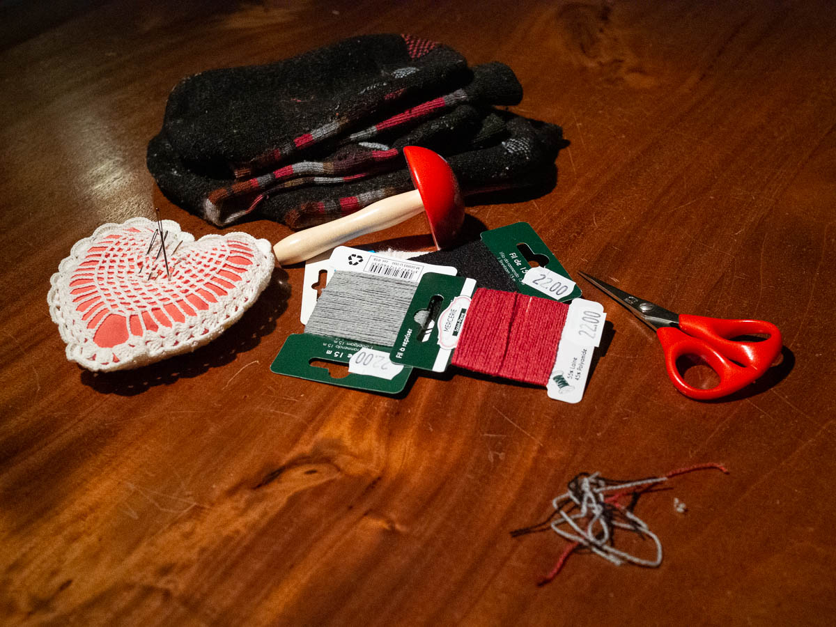 I’m darning socks again. I recently rediscovered a very nice shop that sells Swedish crafts (which I remembered) and crafts materials (which I had mostly forgotten). The best thing they had was darning mushrooms. I’ve been able to darn some of my favourite socks anyway, but this makes the job a lot easier, and the end result looks better.