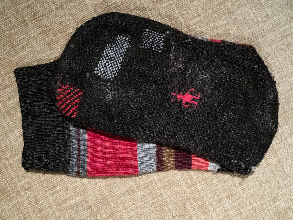 Darning black socks with black yarn turned out to be really hard. In my efforts to see the individual threads I kept stretching the holes too wide, so when I was done with the darning it didn’t lie flat.