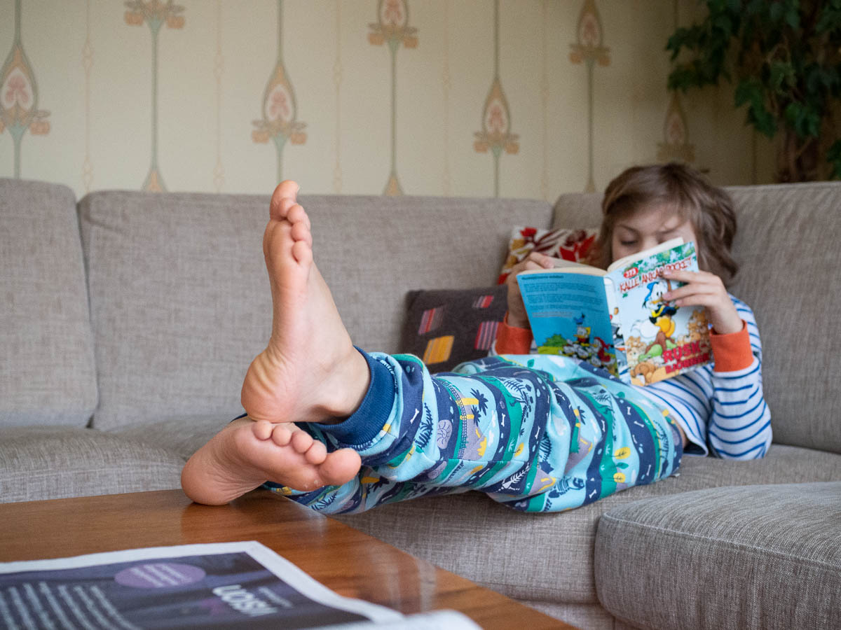 Quintessential Adrian. Dressed in colourful, loose, comfy clothes, slouched in his favourite corner in the sofa, feet on the table, reading Kalle Anka.
