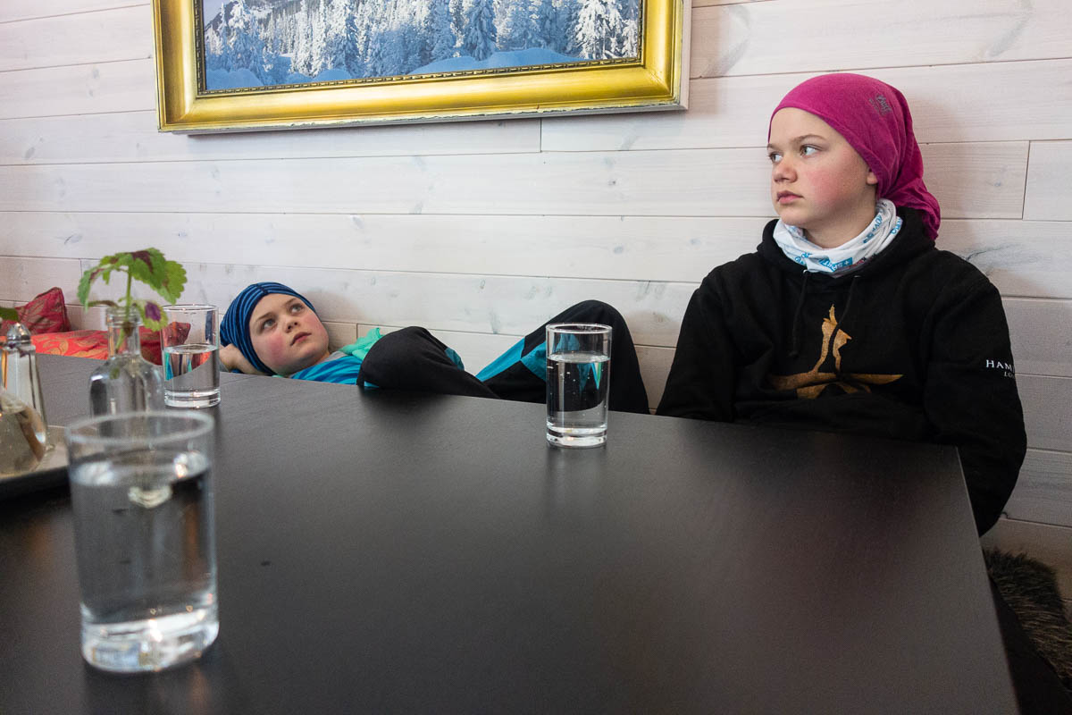 By lunchtime the kids were already tired. The skiing was nicer in the afternoon and we got some beautiful moments of sunshine. But after last night’s short sleep we felt quite done by around 15.