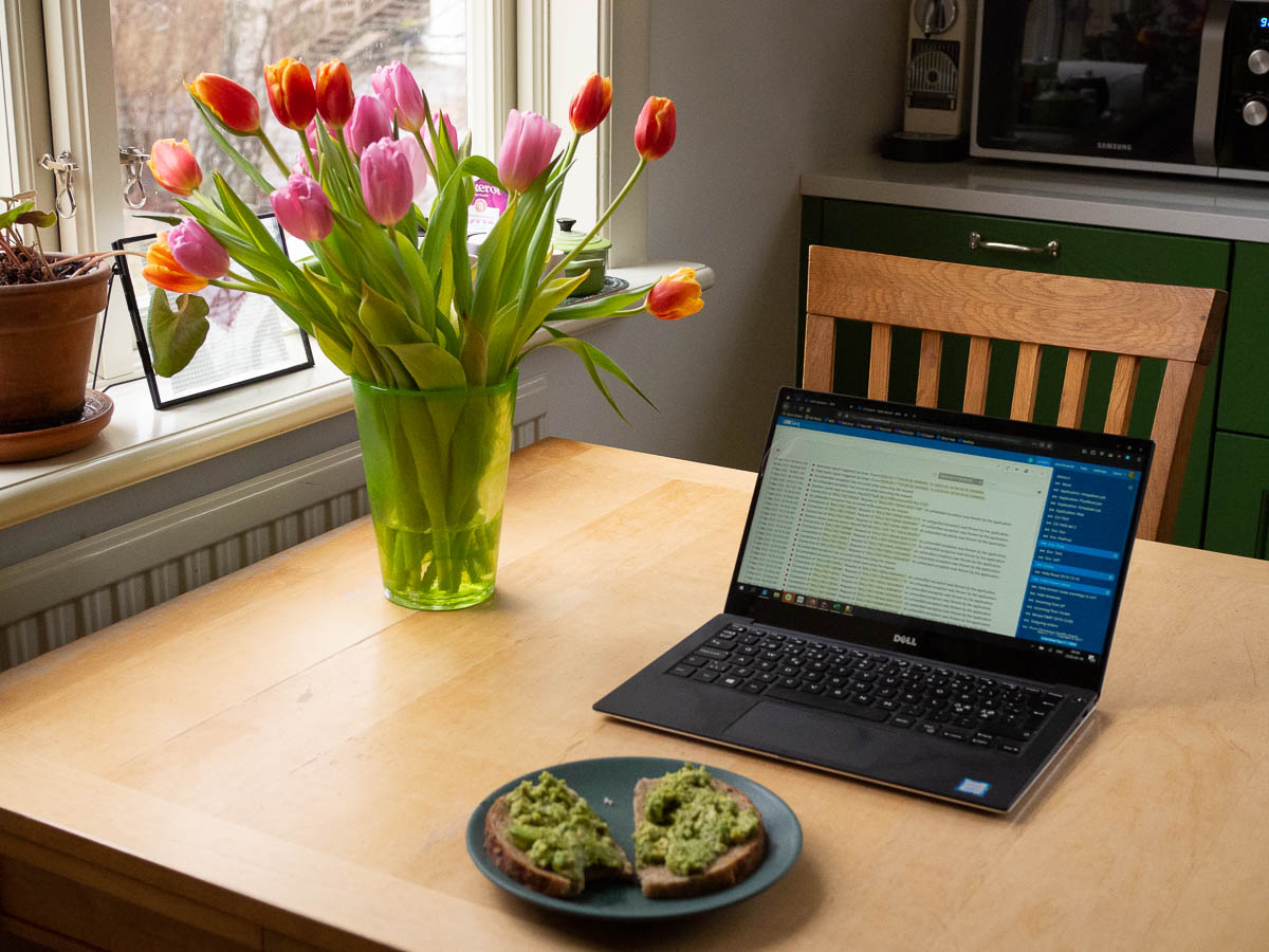 Working from home has its benefits. I can, for example, make myself a nicer breakfast, with smashed avocado on my buttered bread. And then eat it at the kitchen table, with views of tulips, and a squirrel on the bird feeder outside.