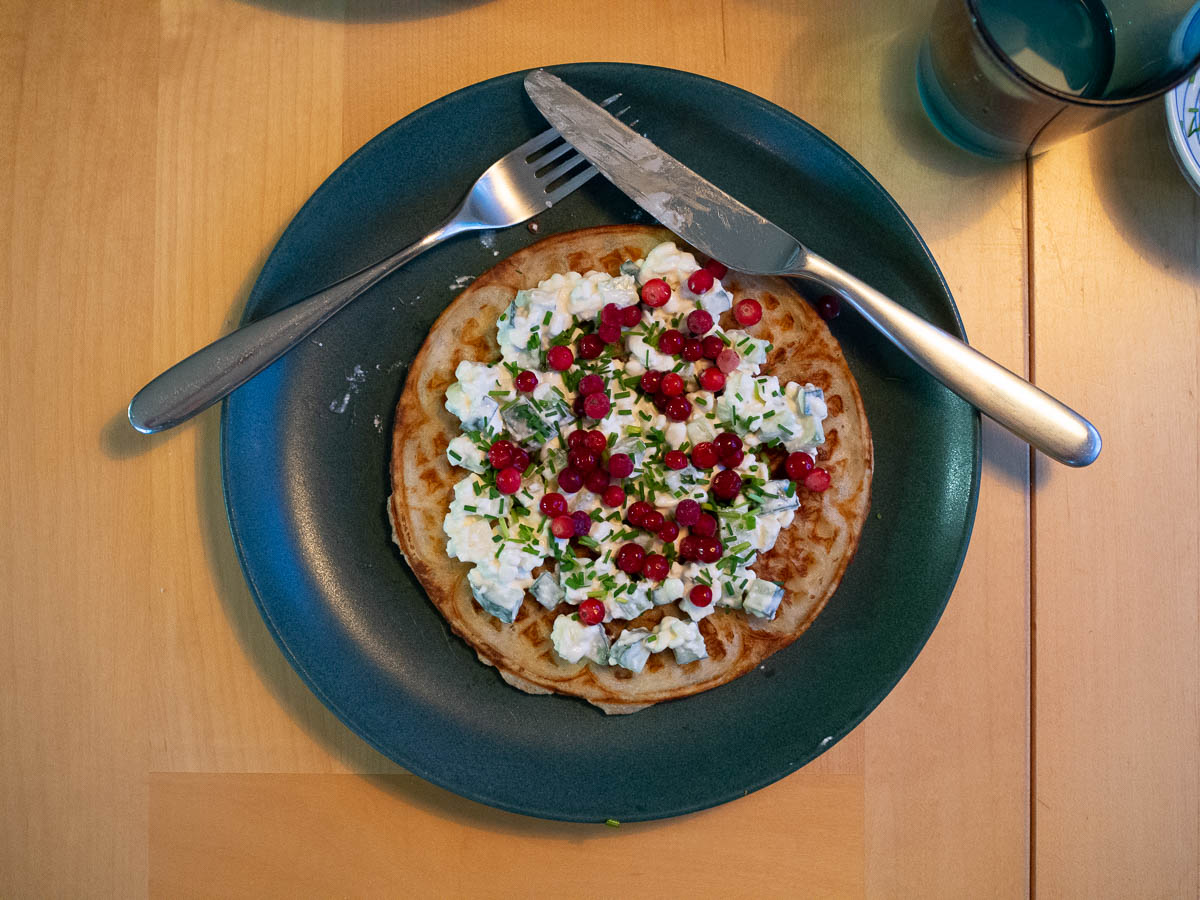 I found a recipe for waffles with lingonberries which sounded delicious. When I tried cooking them, the berries all got burnt and stuck to the waffle iron, no matter how much I coated them in batter. So I ended up putting the lingonberries on top of my waffle topping (of cottage cheese, cucumber, apple and mayonnaise). Not exactly what I had in mind, but it tasted really good nevertheless.