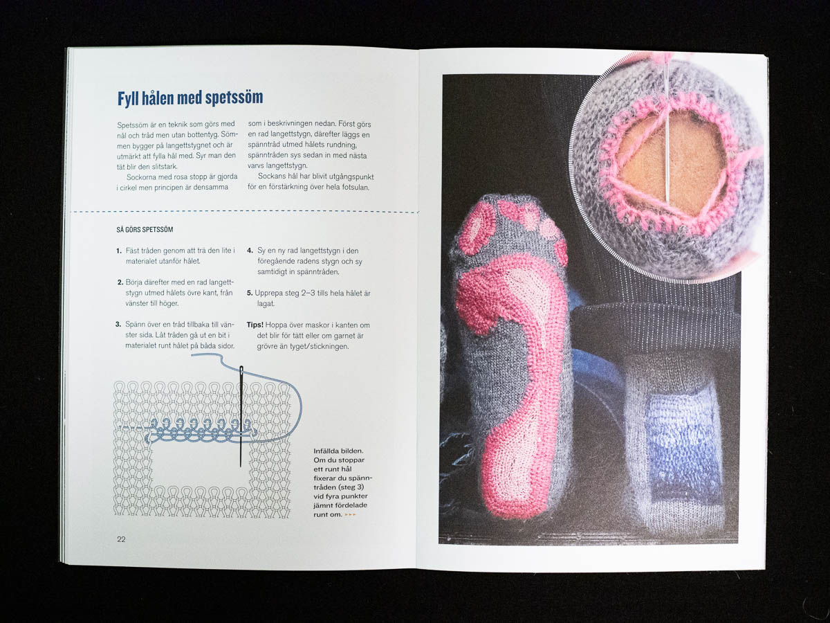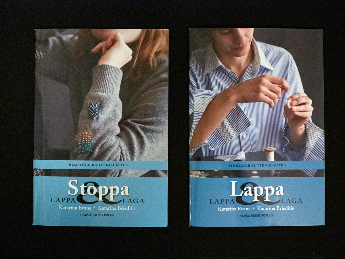 The two are called simply Lappa and Stoppa – “Patch” and “Darn”. They’re published by Hemslöjdens Förlag, a small publishing house (owned by a non-profit) that specializes in books about crafts. These two are part of their “technique booklets” series – slim, focused, practically oriented booklets about a specific technique, such as darning. Their other books are also practical in nature, rather than shiny heavy coffee table books.