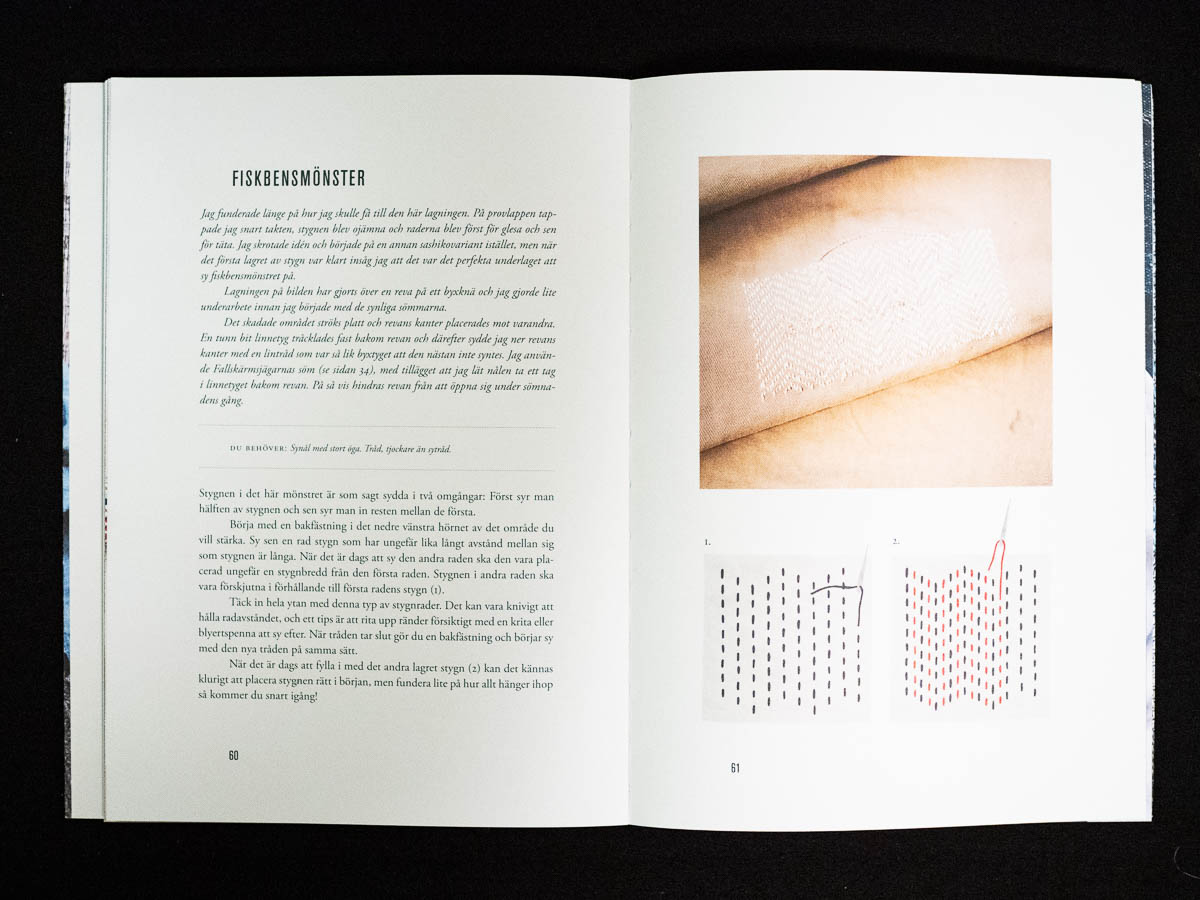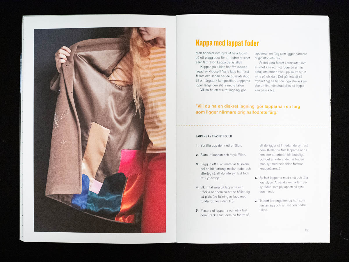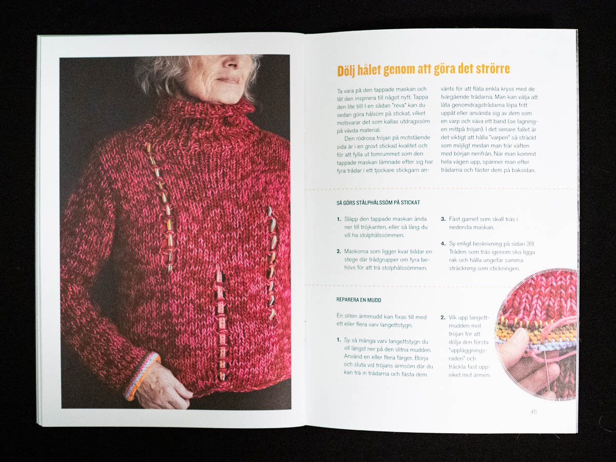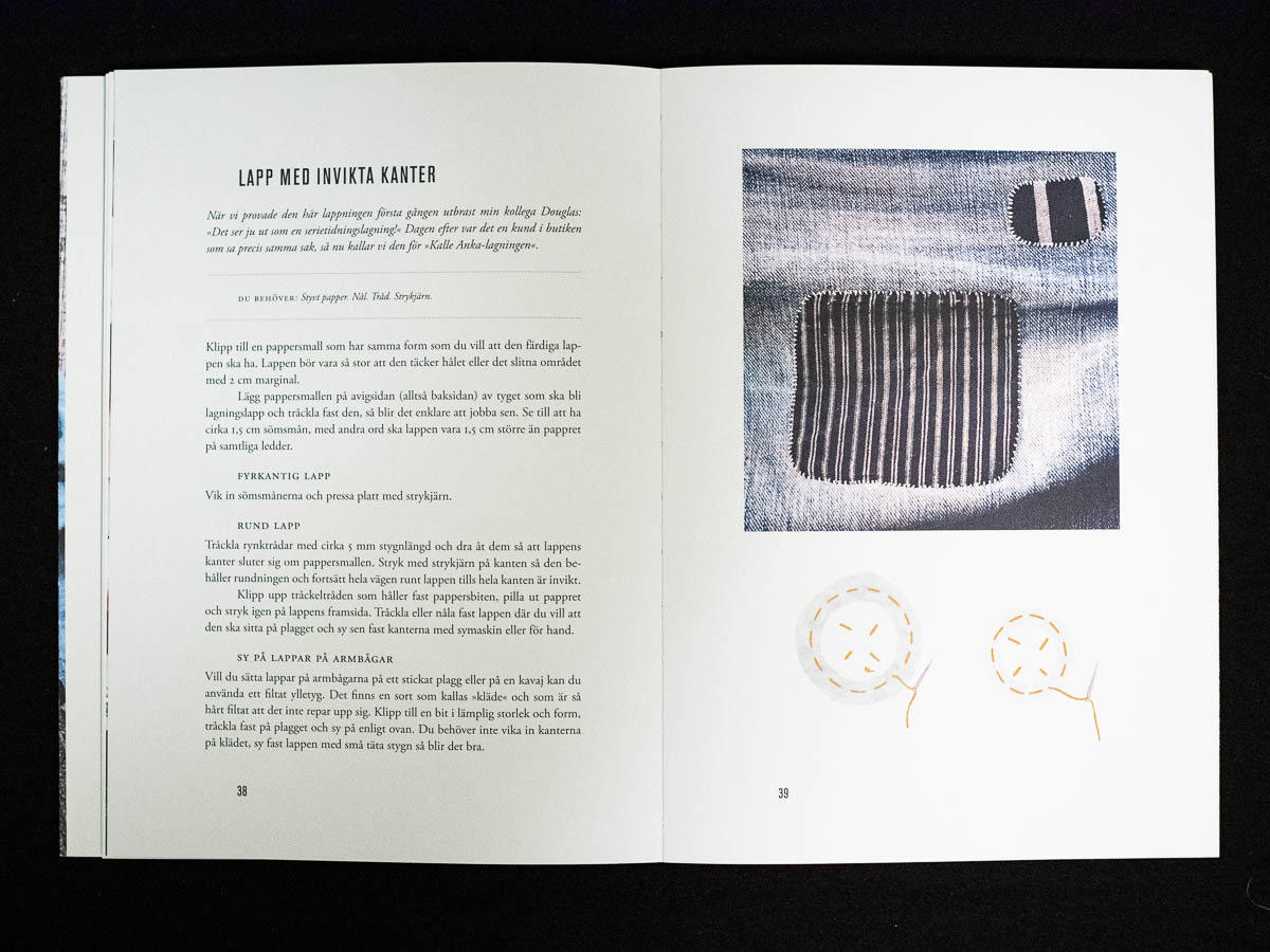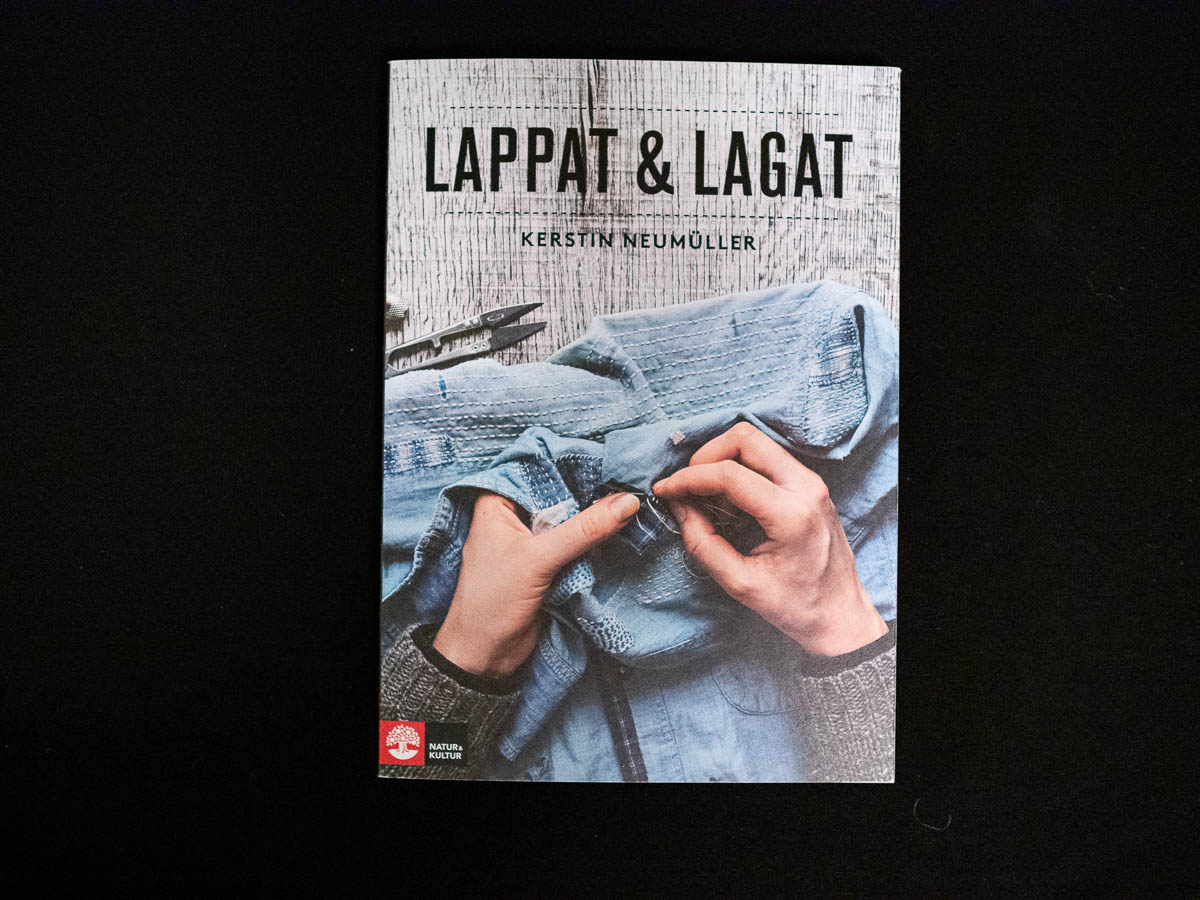 The standalone book by Kerstin Neumüller is also named simply Lappat & lagat, “Patched and mended”. It’s an actual book, thicker and more solid than the two booklets, and covers a broader range of mending topics than just patching and darning: how to repair a buttonhole, how to repair leather goods, etc. It’s more solid and serious in tone as well. More instruction and less inspiration; more text and fewer step-by-step lists. It’s a useful book and I’ve learned things from it, and if I didn’t have the others I’d probably be quite happy with it – but it’s simply not quite as much fun to pick up than the other two.