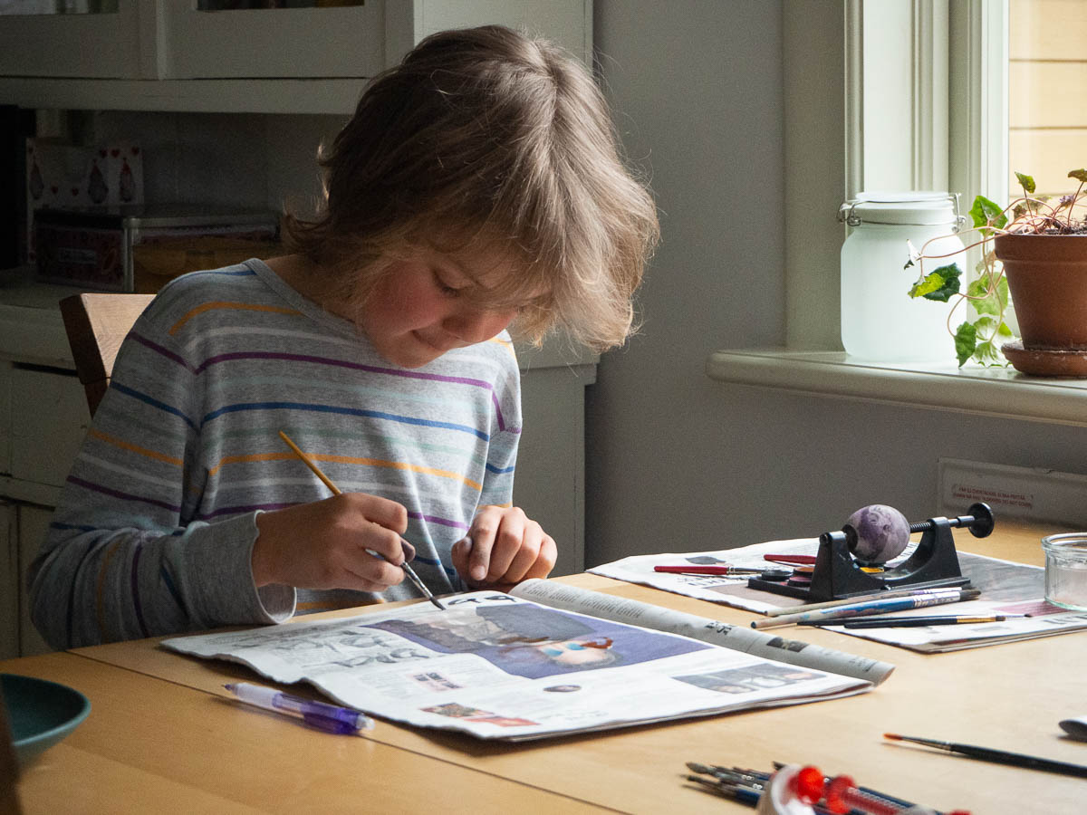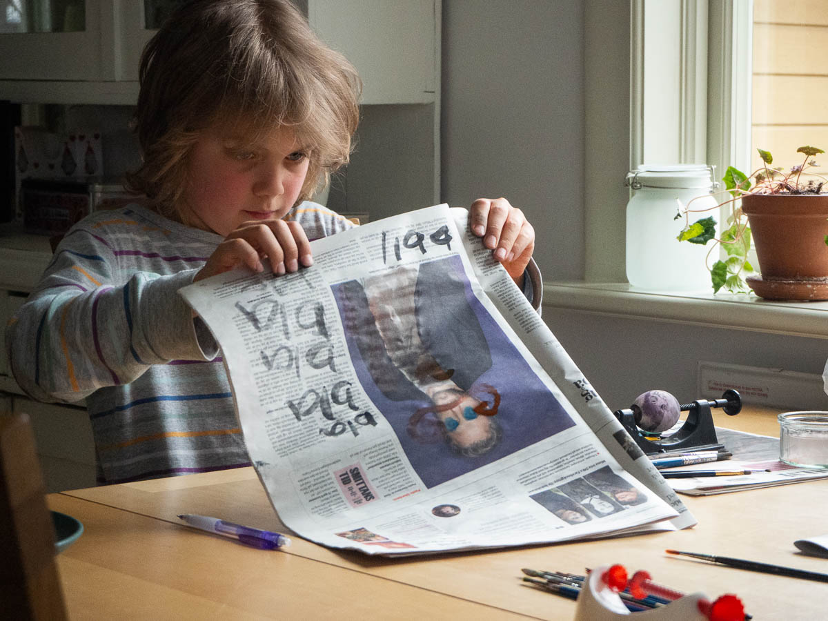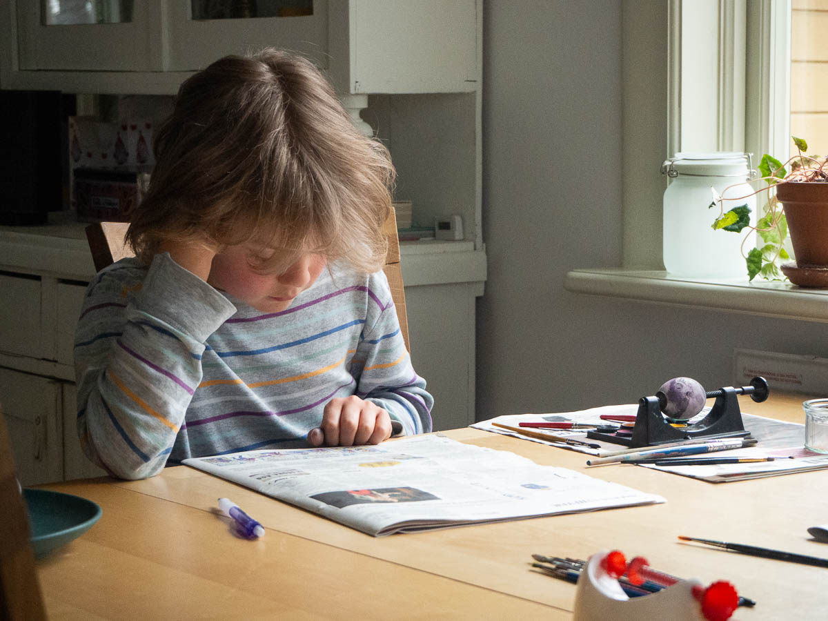 Adrian quickly finished his first egg but then struggled to find ideas for the next one. Instead he painted the newspaper protecting the kitchen table, and then got caught up in some article.