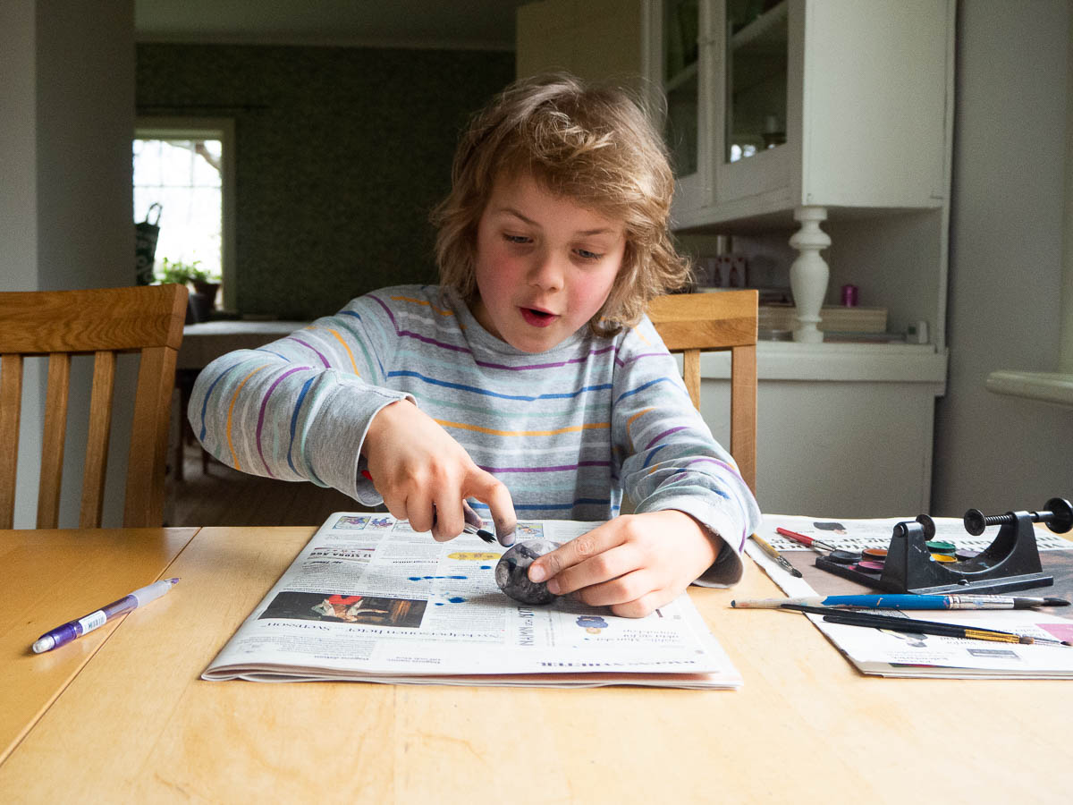 Finally I suggested that he just pick a colour and start putting some paint on the egg, and that was enough to get him unstuck.