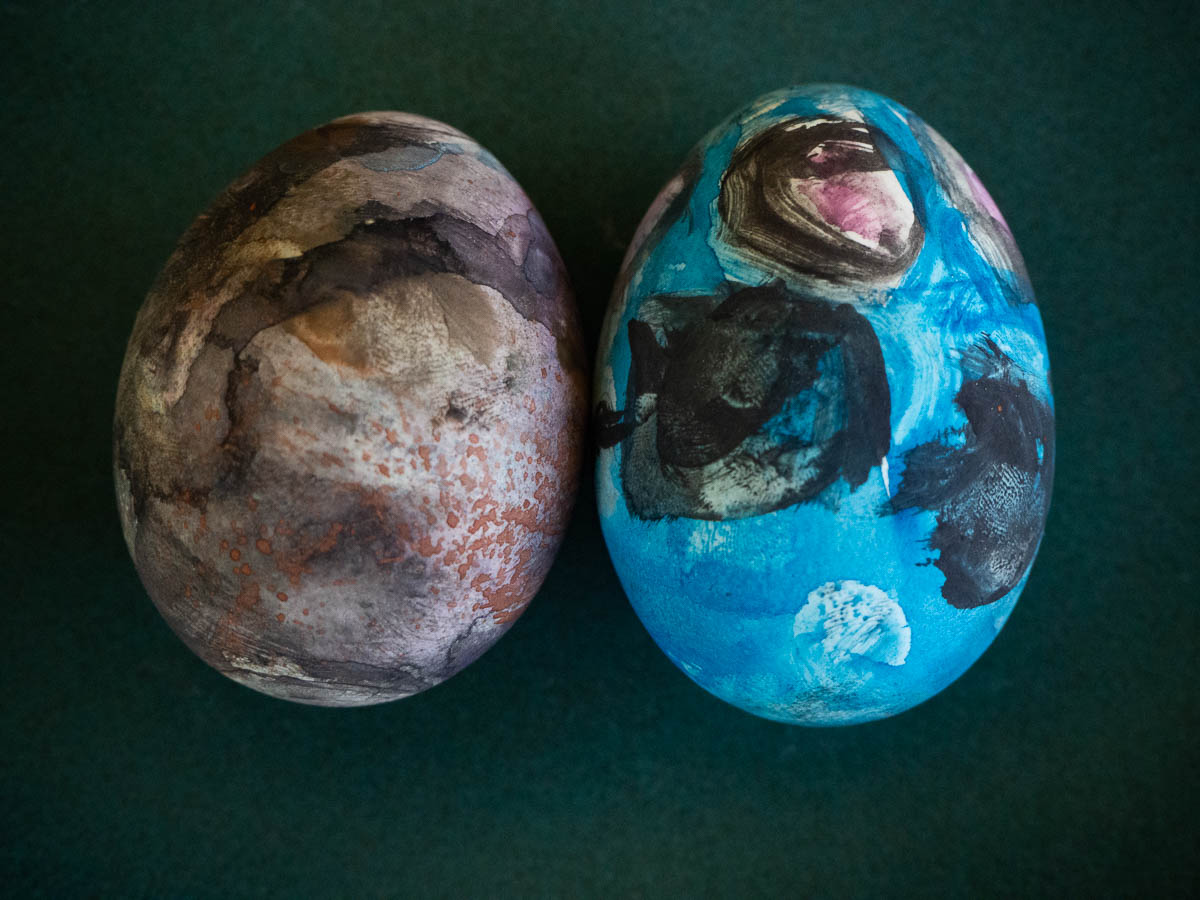 He usually makes abstract designs on his eggs, and today was no exception. This is him with a dark egg that he energetically splatters with small speckles for a starry-sky effect.