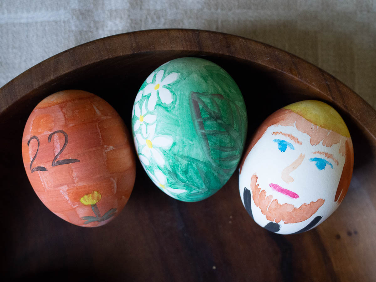 On our way back we had an Easter egg hunt. I hid eggs for Ingrid on one side of the path, and she hid eggs for Adrian on the other. We’ve done this in our own garden several times, but there aren’t that many good places to hide colourful eggs in a bare, early-April garden, so this was a lot more fun. Under roots and under rocks and under twigs and moss. I wish I had thought to take close-up photos.