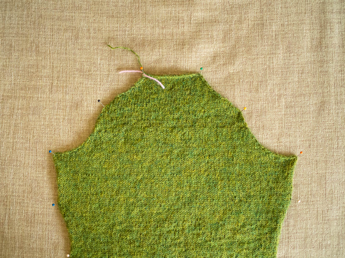 The sleeve cap was hardest to adjust because it has so many adjustable parts. First I tried adjusting for my tighter gauge by following the instructions for a larger size. The sleeve cap came out way too small. Then I tried to eyeball the adjustments and made a new attempt. The sleeve cap came out too large. The third time I measured and calculated and read up on sleeve cap shaping and even pulled out Pythagoras’ theorem. And now the sleeve cap curve length matches the circumference of the armhole, give or take half a centimetre.