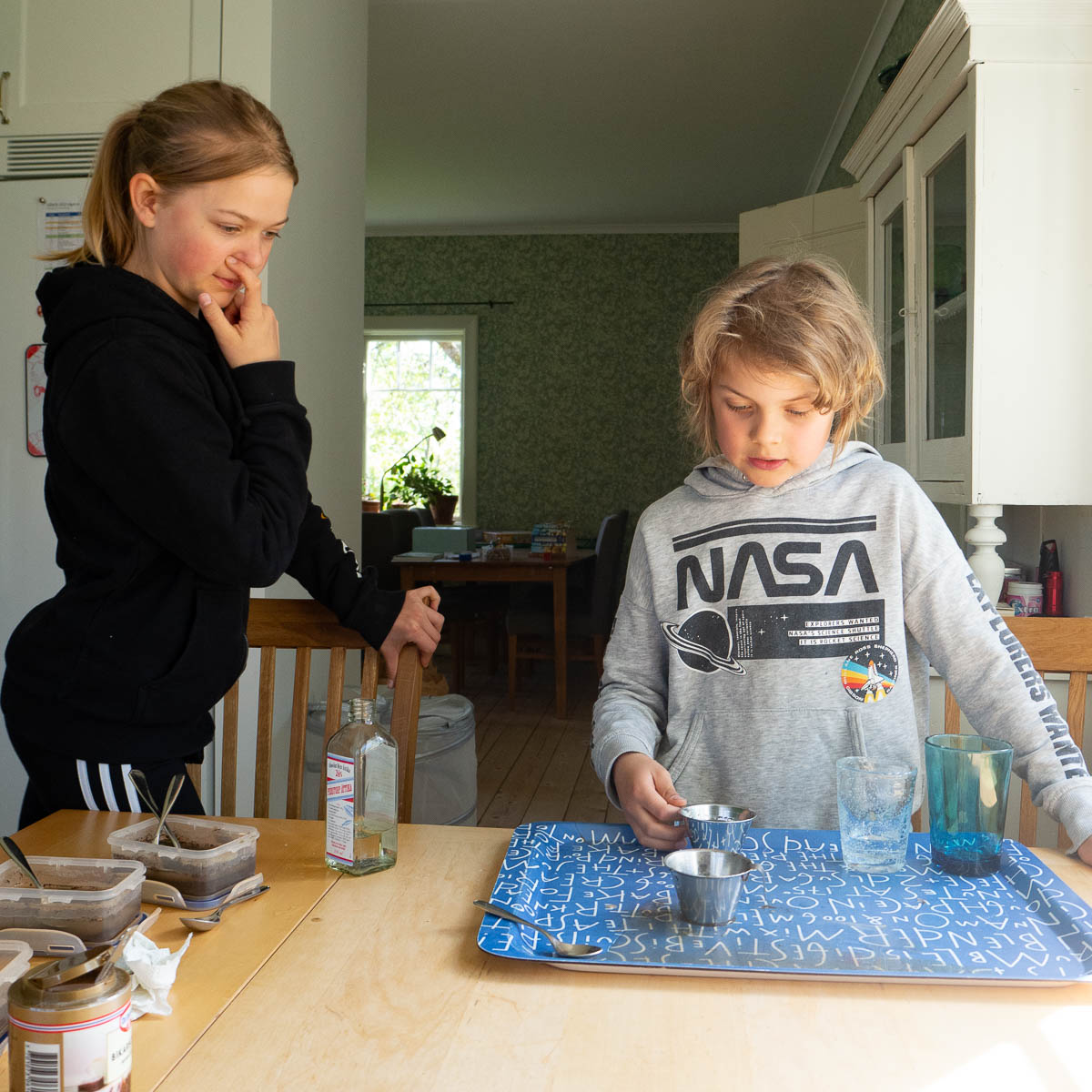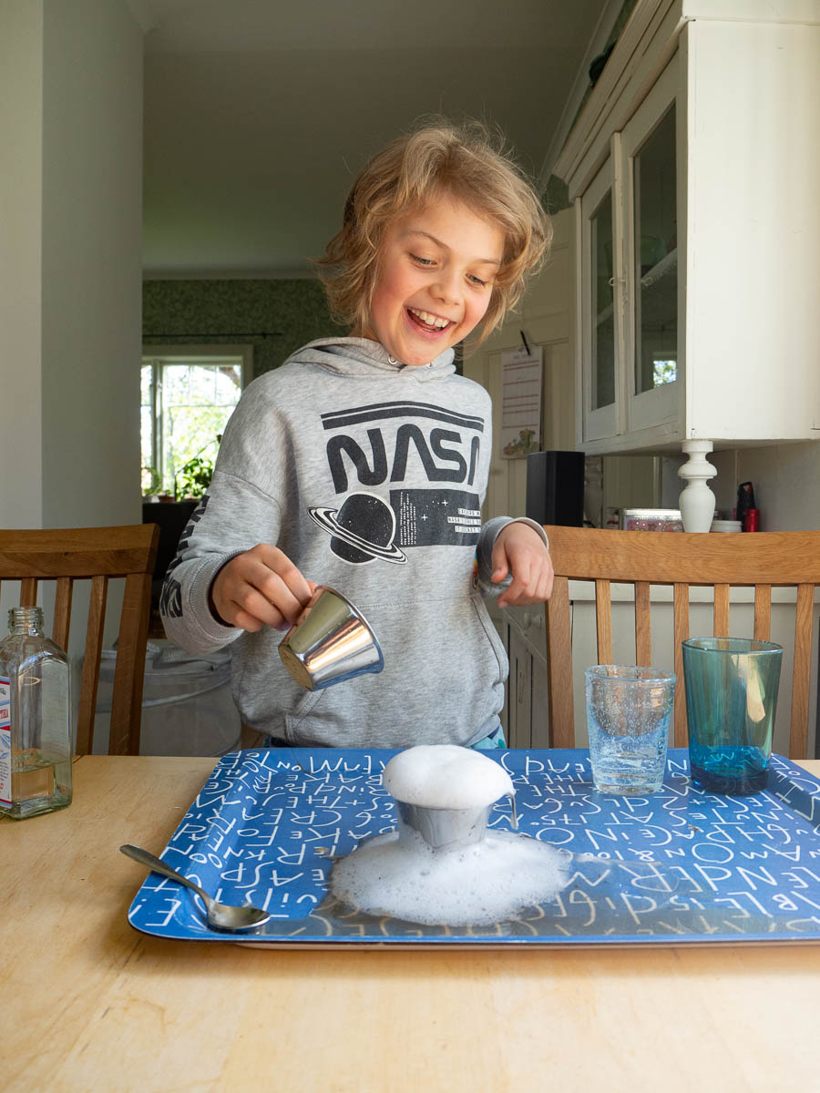 But chemistry that doesn’t go fizz and bang and change colours is very dissatisfying. When we were done with the testing, Adrian got to pour the vinegar-mixed sample onto the bicarbonate sample to at least get some proper fizzing out of it. Much better!
