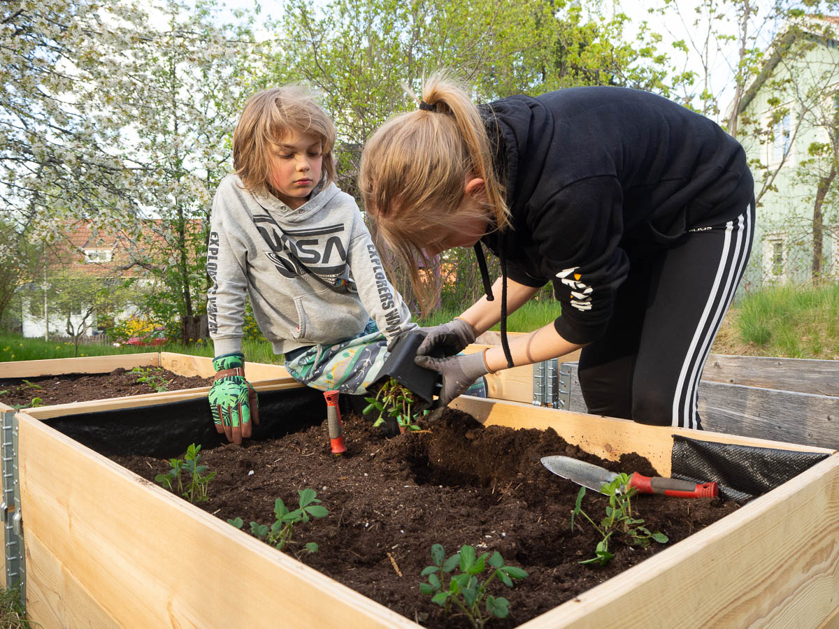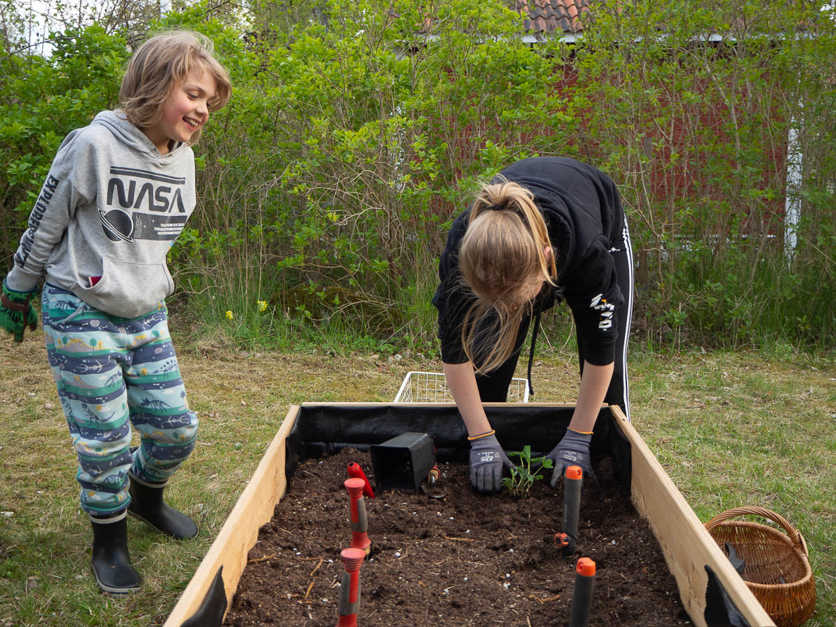In the afternoon we planted more strawberry seedlings. That is, Ingrid planted strawberry seedlings, while Adrian planted my hand tools (in neat, straight rows and at equal distances and at the same depth!) and I took photos.