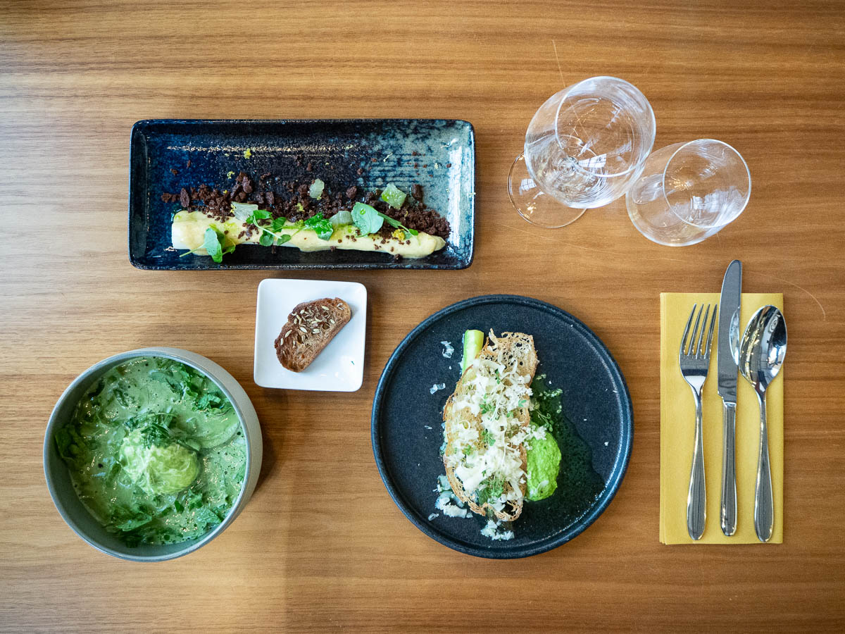 I’ve been thinking of how to characterize this chef’s style of cooking, which is rather different from mine. It’s very “restaurant-y”, somehow. Fine dining in a vaguely French-inspired manner. Each course we made consisted of several components – a little bit of this, a small heap of that, toppings of various kinds, and herbs everywhere. Somewhat fussy for my taste – I would have used fewer parts and let each of them get more attention.