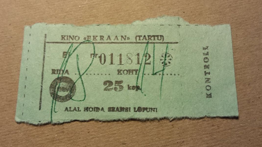 Tickets were made of paper. I found this photo of an old ticket from Ekraan at an auction site in Estonia. The row and seat numbers are hand-written. A grumpy middle-aged lady sat in a booth in the entry hall and sold them. When you had chosen a seat, the lady crossed that seat off the seating map, wrote the row and seat numbers on a blank ticket, and tore it off the ticket block.