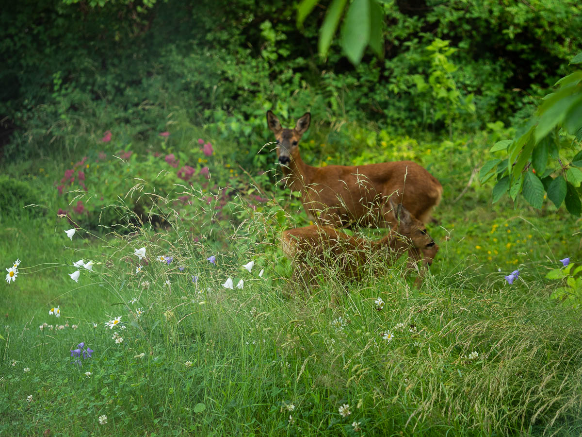 A mama deer with its kid passed through the garden again this evening. They nibbled at various things (cherry branches, the round thujas, hydrangea flowers). Interestingly they ignored the clover patch.