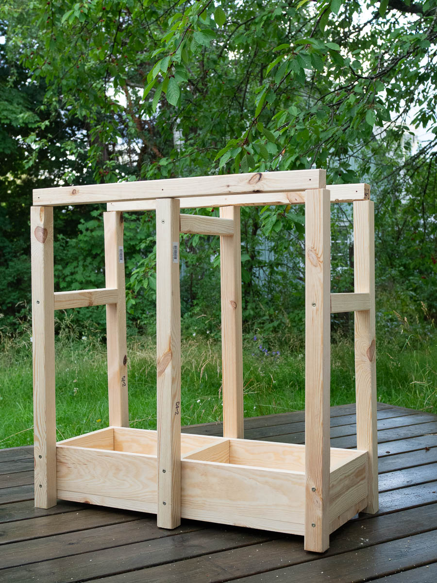 It’s functional and solid, but a closer look shows it’s a clumsy thing. I forgot to take the offset of the vertical pieces into account when measuring and cutting the top pieces, so the top pieces are 1 cm too short at each end.
