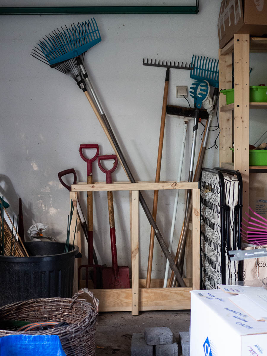 Today I built a storage thing for our garden tools – rakes, spades, apple pickers etc. The tools are now contained and supported, and grabbing one no longer makes the others fall down. A “someday” project I can cross off my list now!