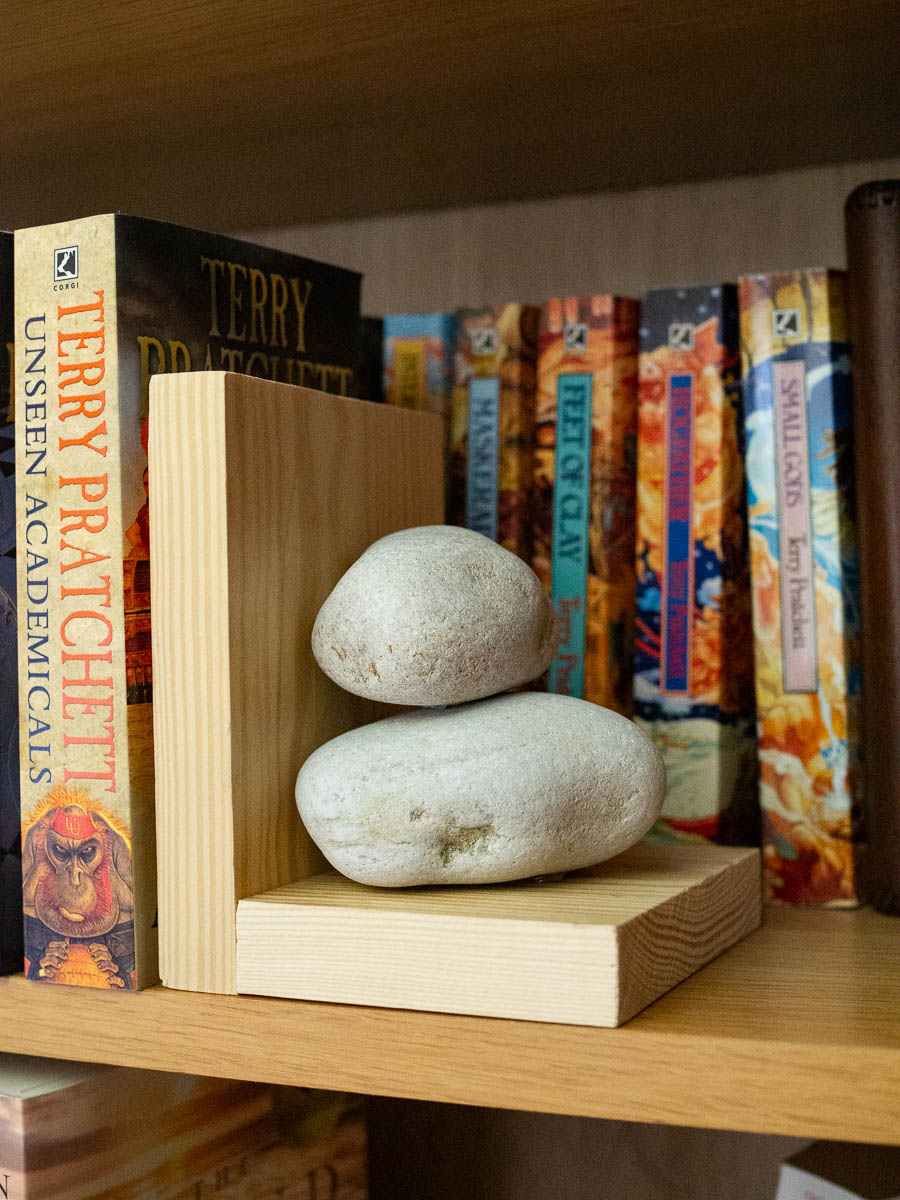 Today I finished a bunch of bookends. I started this project a while ago, and some of the bookends in these photos I made earlier this summer. But today I finished several more, and now I’m feeling done. I could probably find a place in our bookshelves for a few more, but there’s no longer an urgent need for them. Our books are now standing up and not falling down!