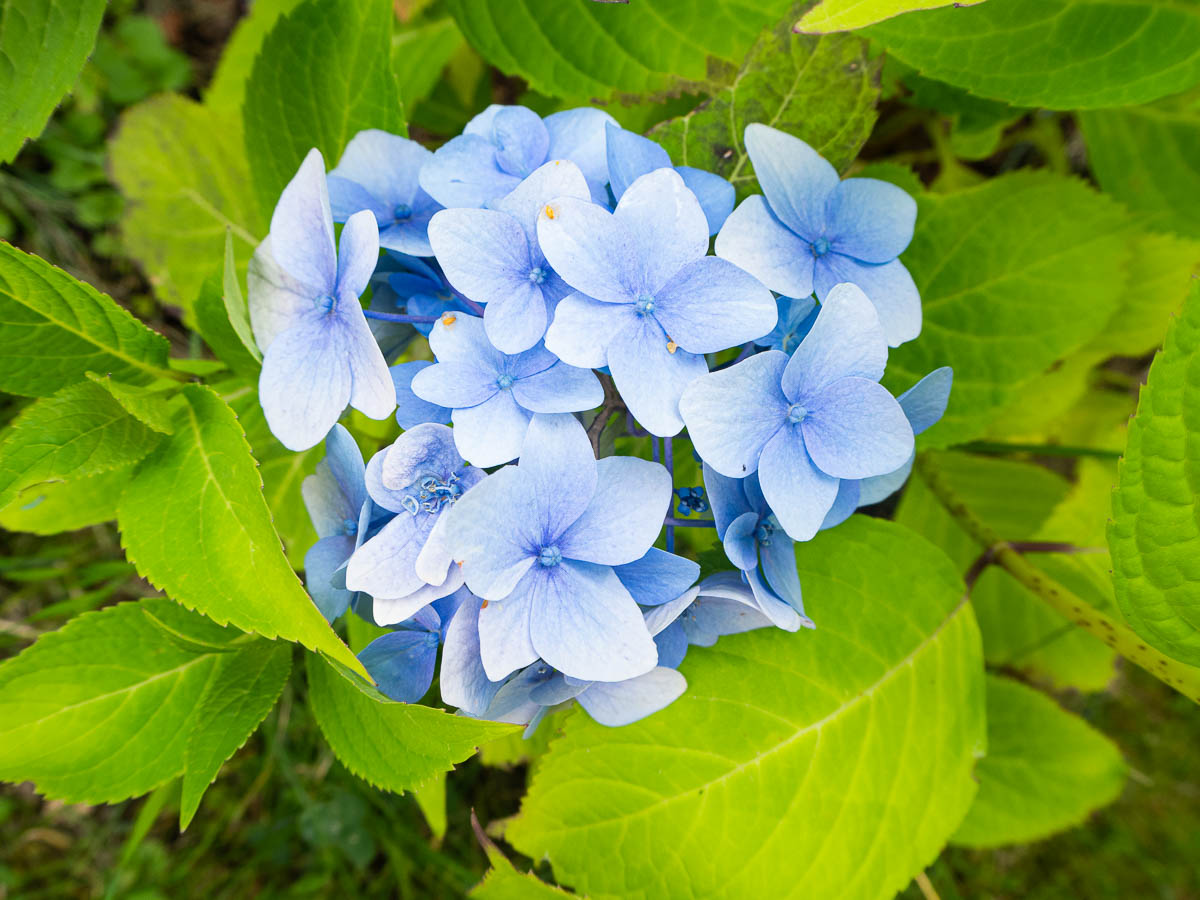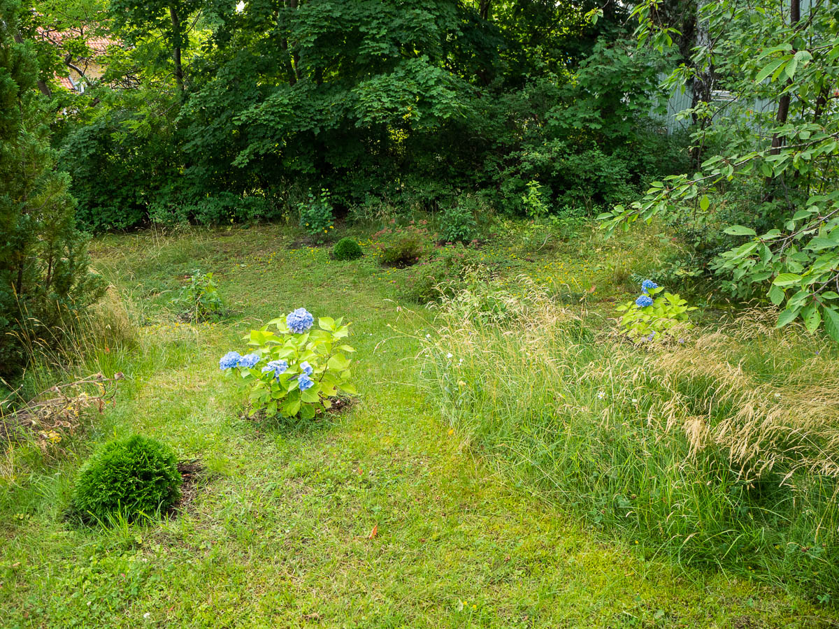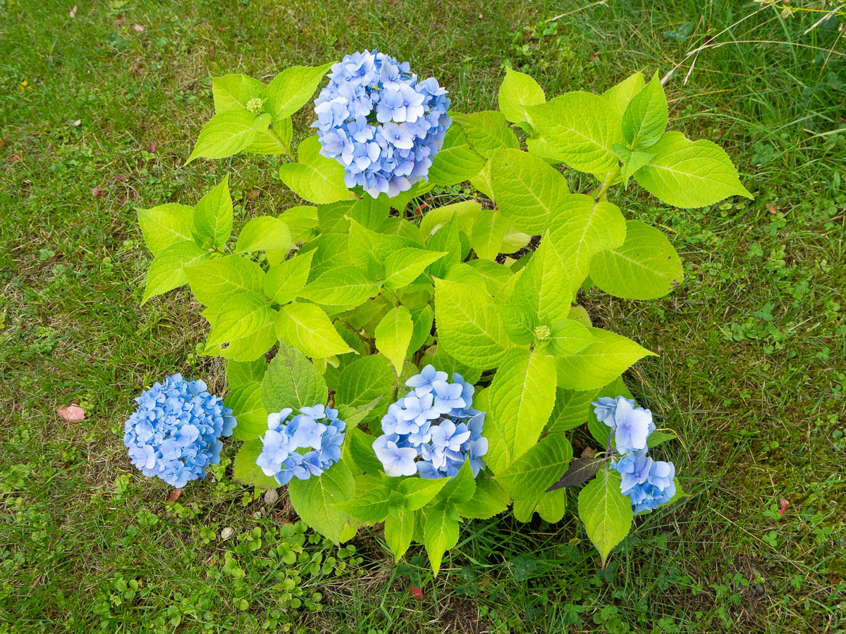 Both hydrangeas are currently flowering with blue flowers. I wonder if that’s because the soil here is slightly acidic after all, or if it’s due to the soil they came with. I guess next summer will show.
